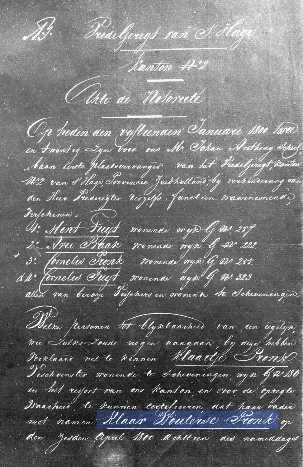 In de huwelijksbijlagen van dochter Klaartje- de vermelding van de door een golf overboord geslagen en verdronken vader Klaar Pronk.