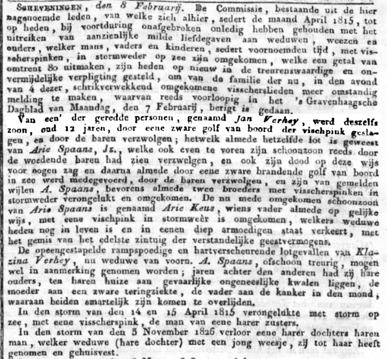 Voor het aanlanden en tijdens een zware stortzee op één der banken voor Scheveningen sloegen drie vissers overboord en verdronken.