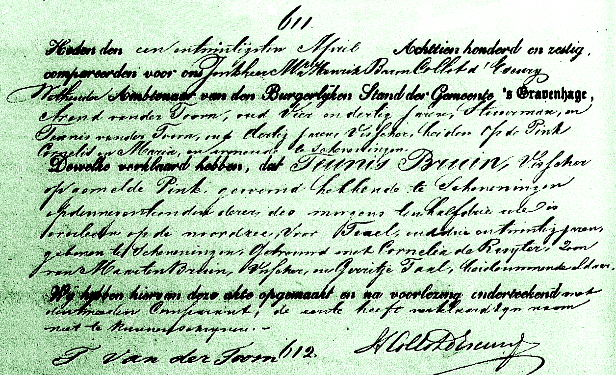 De twee matrozen -Teunis van der Toorn en Teunis Bruin- stonden samen aan het roer in een stormachtige zee nabij Texel. Toen Van der Toorn zijn maat enkele ogenblikken alleen liet kreeg de pink een stortzee over die het grootzeil aan flarden scheurde en het spil aan stukken sloeg. Toen Van der Toorn weer bij het roer terugkwam bleek zijn maat Teunis Bruin van het roer te zijn geslagen en niet meer te zien.