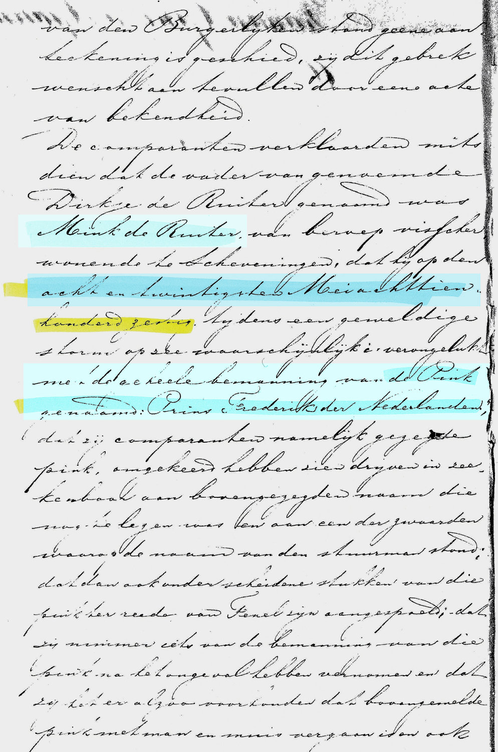Door andere vissers werd de pink ondersteboven gezien waarbij op het zwaard van de naam van stuurman De Ruiter nog zichtbaar was. Op Texel spoelde delen van de pink aan.