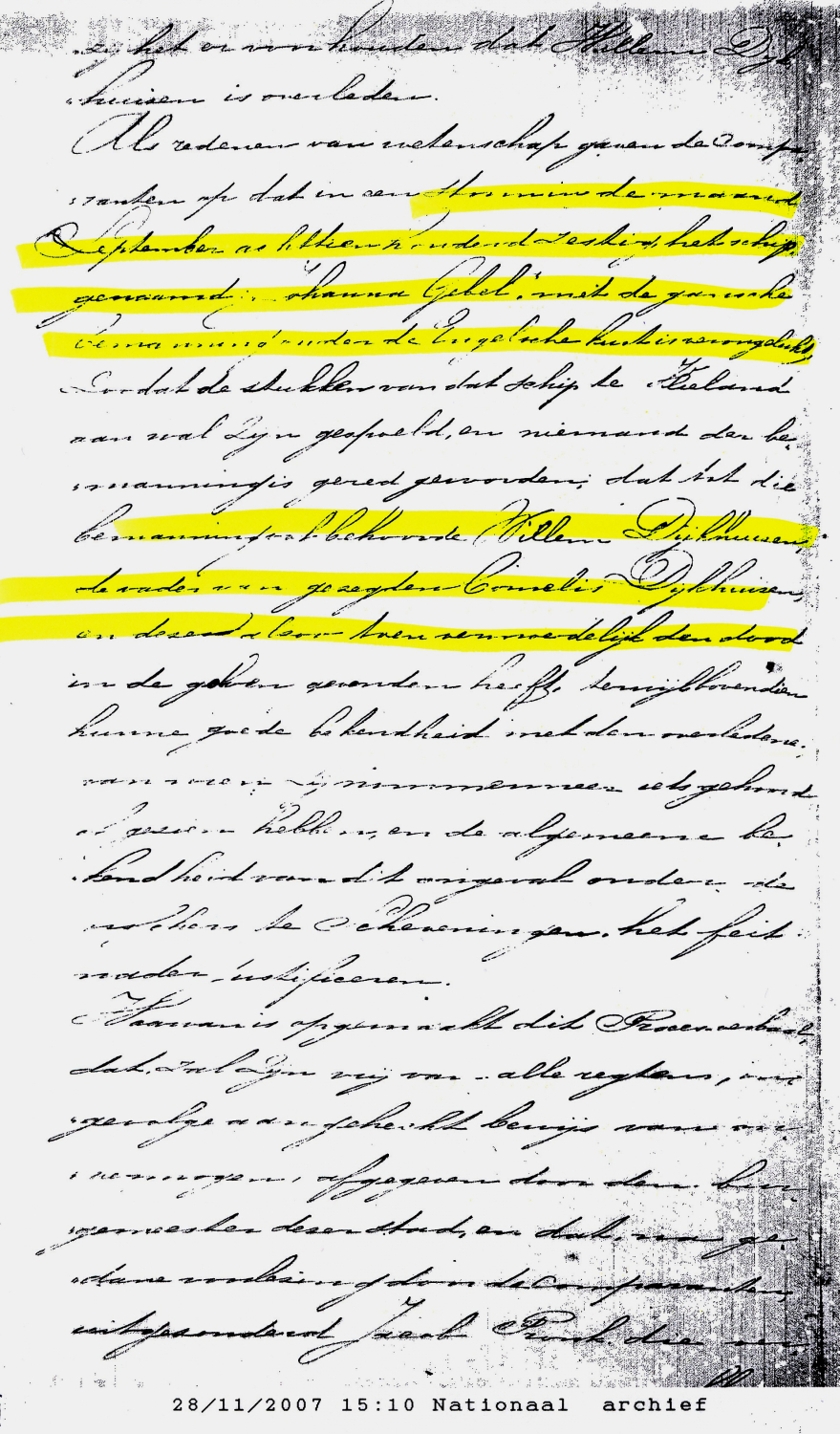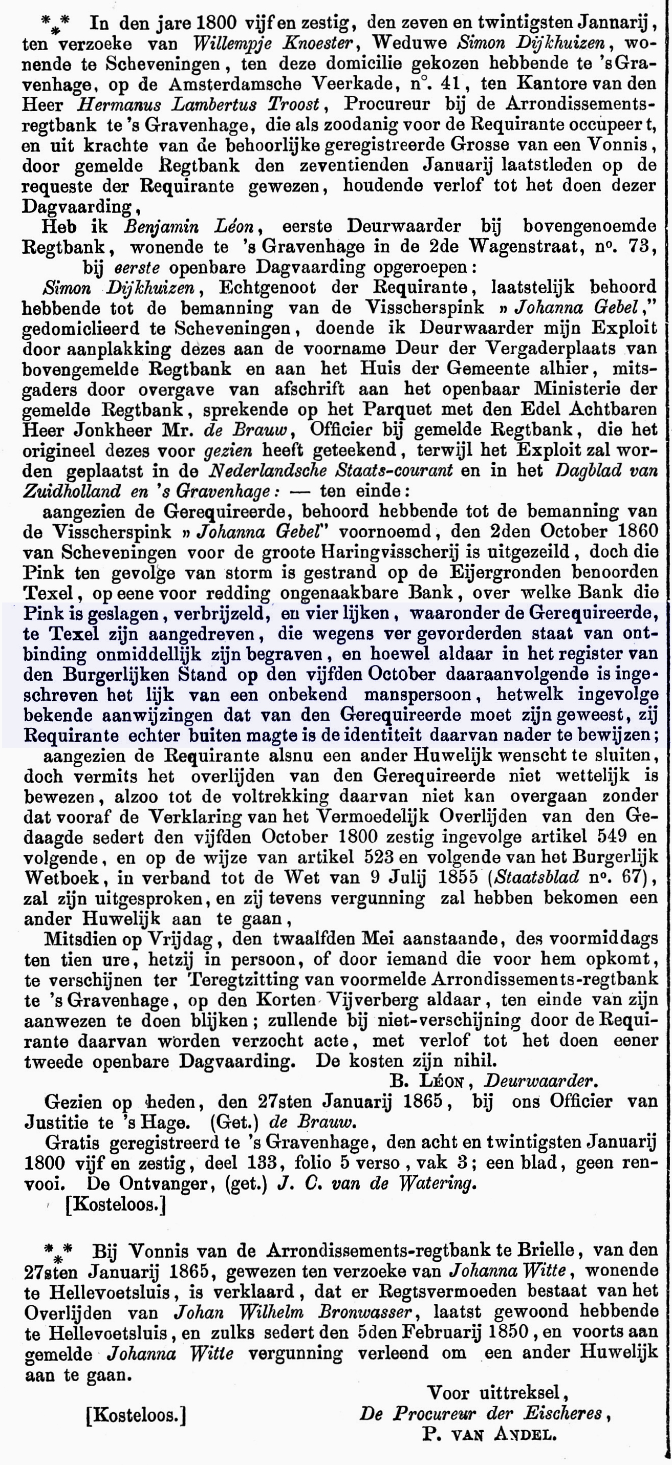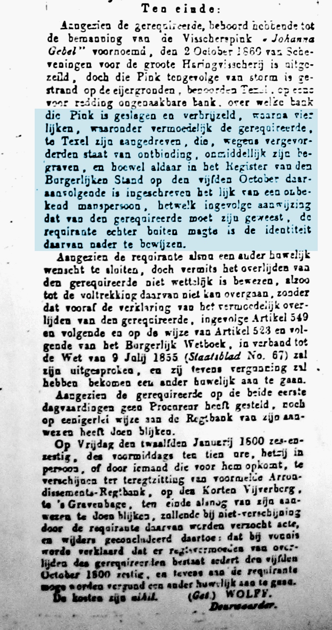 Op 7 oktober kwam er van Texel het bericht dat daar op de Eijerlandsche gronden een Scheveningse haringschuit was gestrand. In het vooronder van het schip bleken zich vier lijken te bevinden. Het vermoeden bestond dat de schuit Johanna Gébel was overzeild waarbij nog vier andere, zich aan dek bevindende vissers, hun dood in de golven hadden gevonden. Daarnaast had het ook gestormd in die dagen waarbij de schuit over de banken bij de Eijerlandsche gronden kon zijn geslagen. Met uitzondering van de zoon van stuurman Pieter Korving waren alle schepelingen vaders van huisgezinnen. Tweeëntwintig kinderen verloren daarbij hun vaders. Scheveninger Albert Mos schoot met dit drama de rederes Gébel, te hulp. Hij vertrok nog op de dag van het bericht met een pink van stuurman A. Kuiper naar Texel om de gevonden lichamen voor het begraven te identificeren. Daarnaast zouden Mos en Kuiper de staat van het schip inspecteren of het mogelijk zou zijn om het schip naar Scheveningen terug te halen.