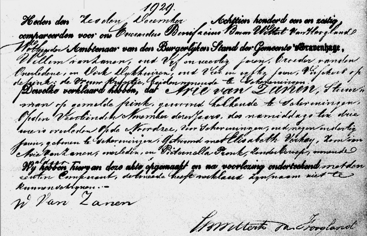 Op 15 november liep de pink van reder K. Pronk en Co. op het strand van Zandvoort. De bemanning had kort daarvoor een noodweer doorstaan en daarbij hadden zij hun stuurman Arie van Zanen verloren. Zijn aan boord aanwezige zoon moest toezien hoe zijn vader overboord sloeg en in de golven omkwam.