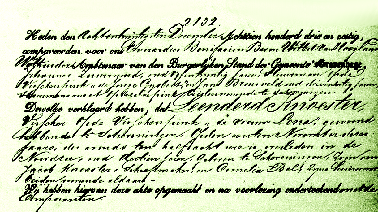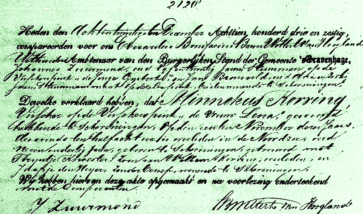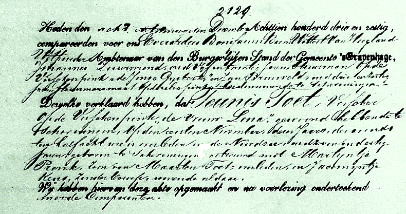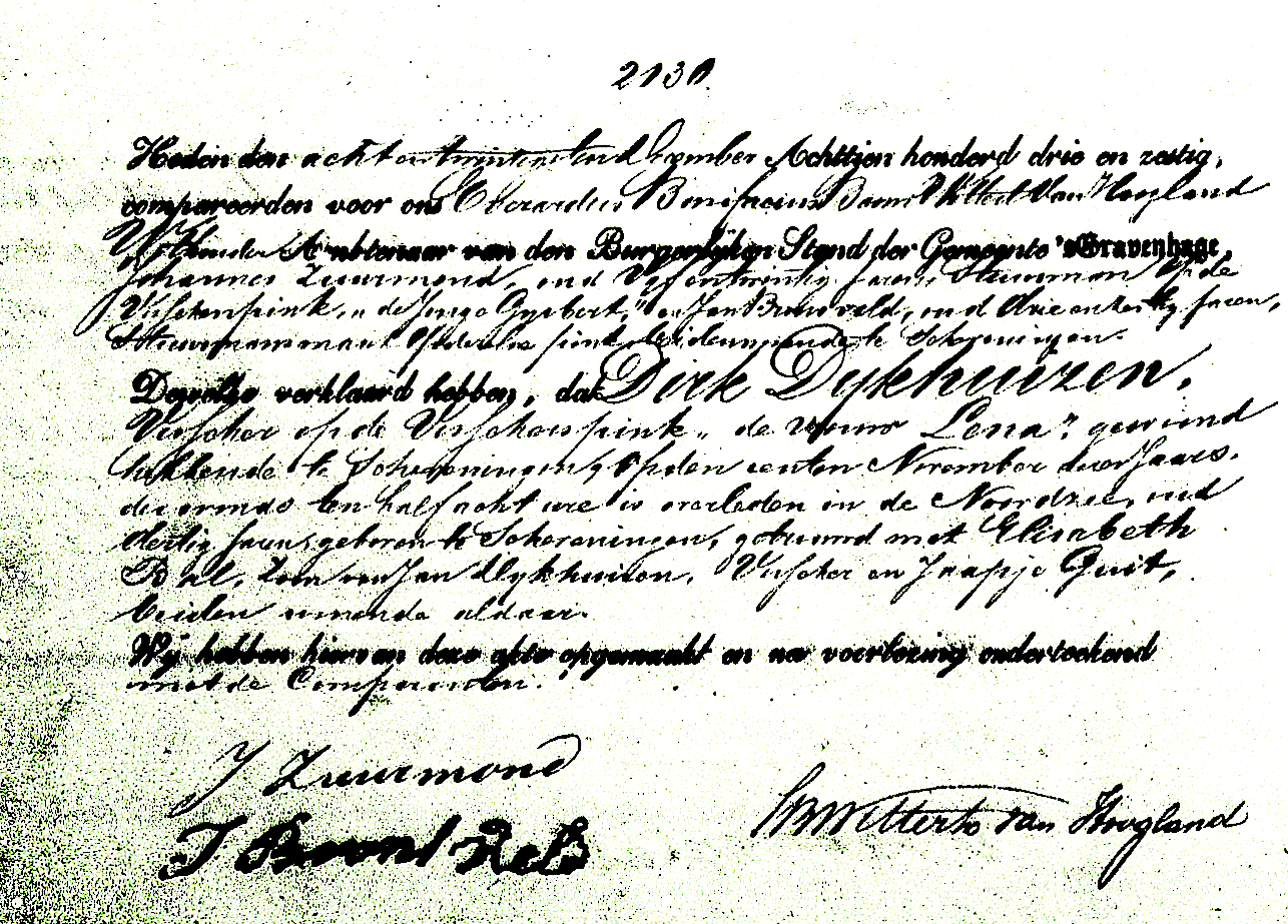 Op 5 november 1863 keerde de pink De Jonge Gijsbert terug uit zee. De stuurman daarvan, Johannes Zuurmond, bracht slechte tijding mee. Op 1 november, twee uur uit de wal van het Engelse Lowestoft, had hij de pink De Vrouw Lena, van dezelfde eigenaresse aangevaren. De pink, met een bemanning van 8 koppen, verdween vrijwel direct in de diepte.