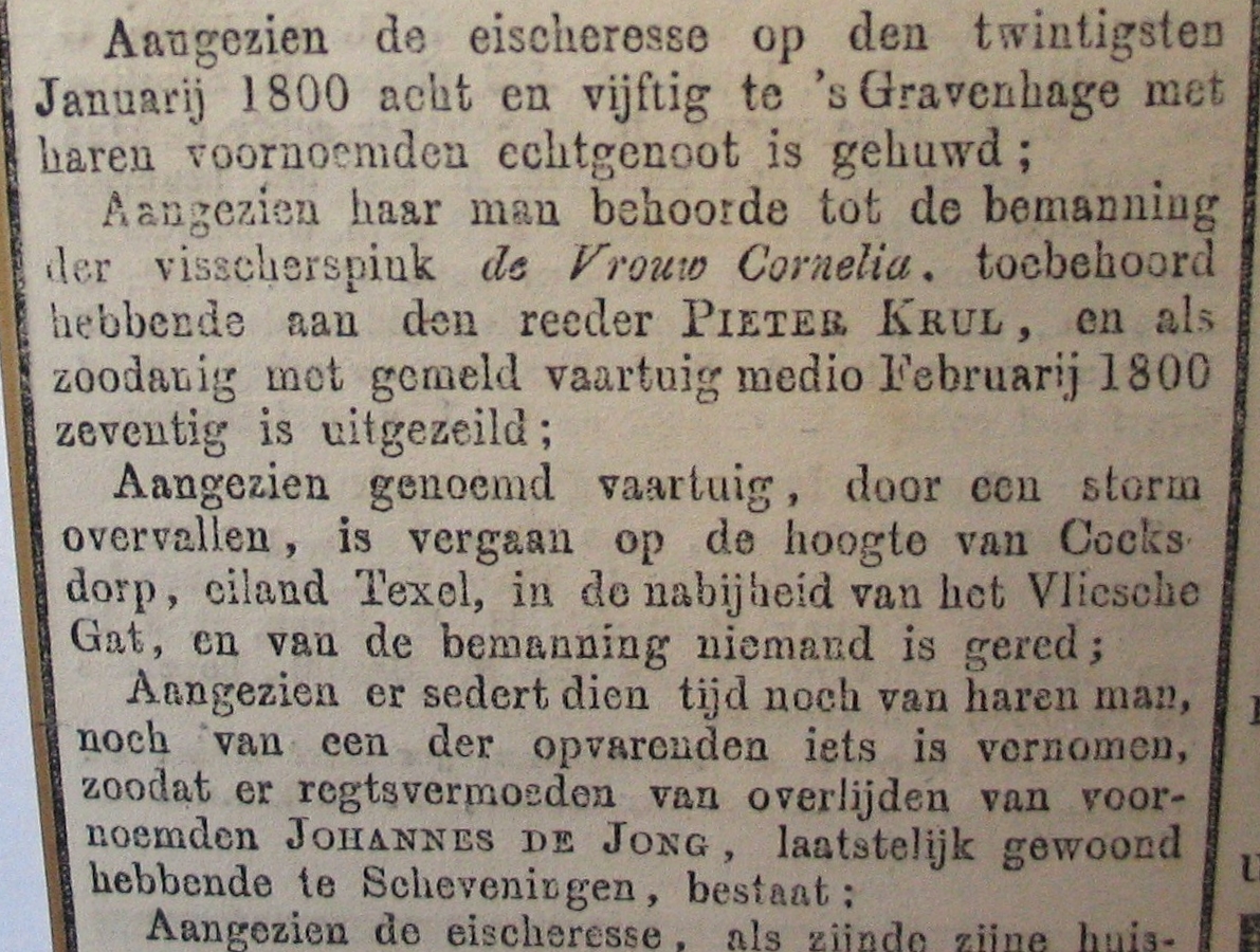 Rond 22 februari kwam er van Vlieland een telegram dat er twee Scheveningse pinken tijdens slecht weer met het aanlopen van de haven van Oost - Vlieland waren omgeslagen. De pink spoelde op het strand van Vlieland aan, maar lichamen werden er in het wrak niet meer aangetroffen.