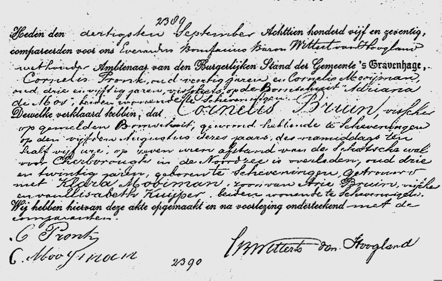 Naar verluidt is Cornelis Bruin in de Noordzee overleden hetgeen op verdrinking duidt.