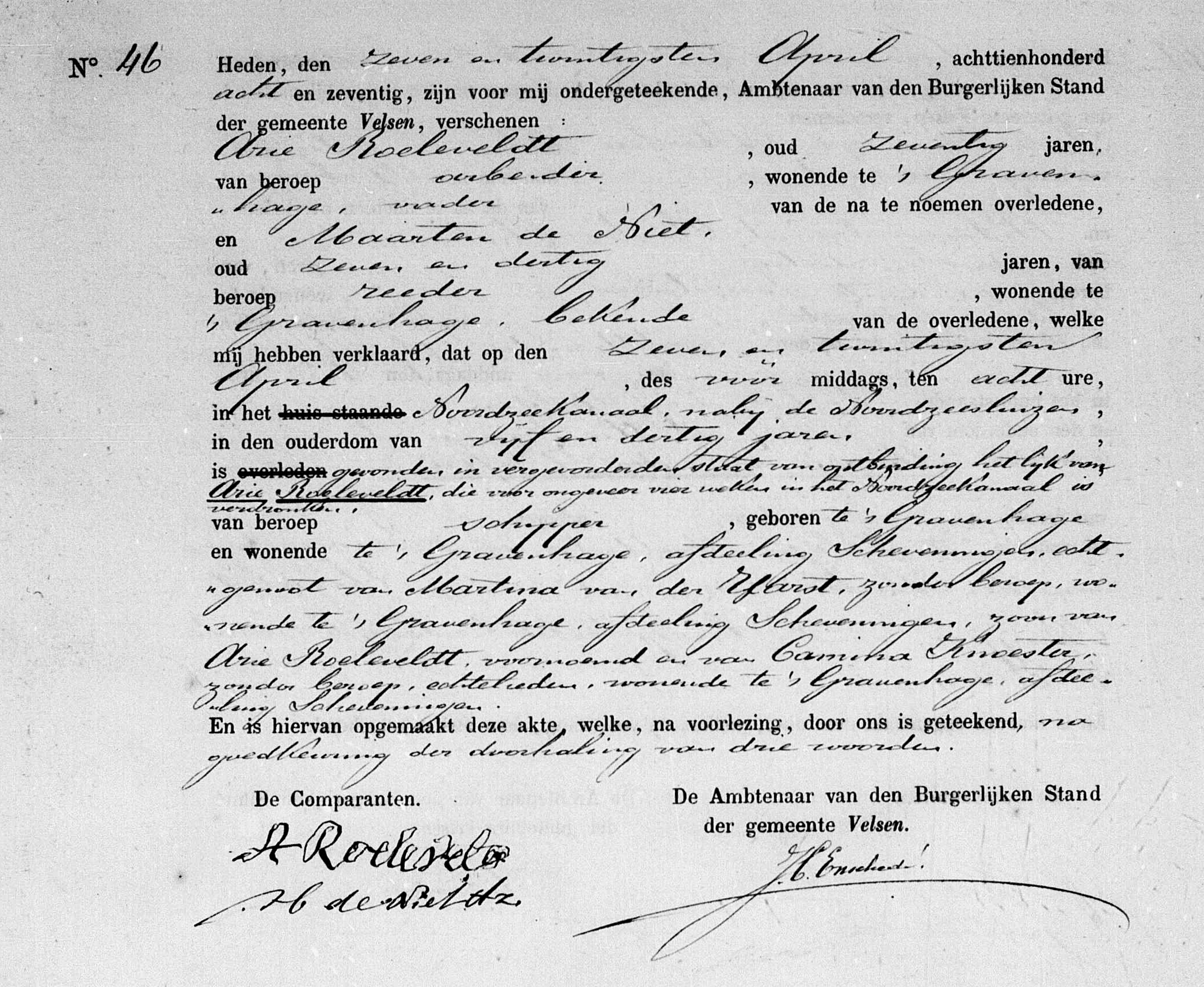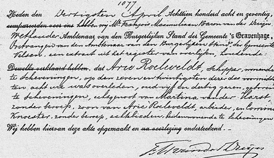 Vanwege het aanhoudende slechte weer, besloten de stuurlieden Arie Pronk van de bomschuit ‘Hoop doet Leven’ en Arie Roeleveld van de schuit ‘De Jonge Arie’ om samen, de haven van IJmuiden binnen te lopen en daar het slechte weer af te wachten. Direct na aankomst begaf stuurman Roeleveld zich aan wal om reder M. de Niet per telegram op de hoogte te stellen van hun behouden aankomst. Echter tijdens het donker weer terug aan boord komen viel hij in het water. Pogingen om hem uit het water te halen mislukte. Nog twee uren werd er naar het lichaam gedregd maar zonder resultaat. Pas op 27 april werd het lichaam gevonden. Nabestaanden en reder De Niet - voor wie Roeleveld 15 jaar als stuurman had gevaren - vertrokken vervolgens naar IJmuiden waar de stuurman werd begraven.