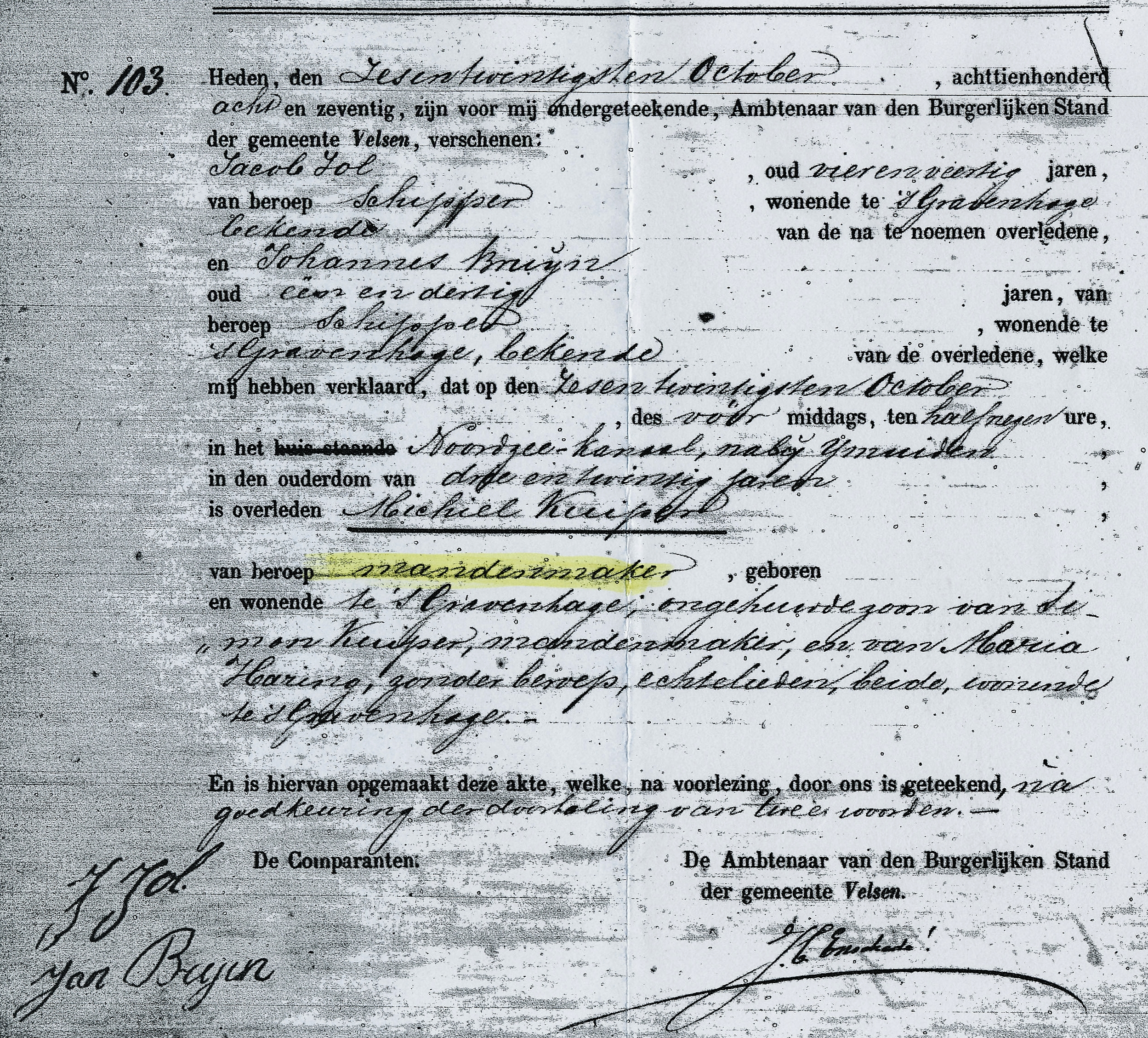 Een misstap of struikeling kostte de ongehuwde matroos Machiel Kuiper het leven nadat hij in de haven van Nieuwediep was gevallen. Andere informatie geeft aan dat de bomschuit in het Noordzeekanaal bij IJmuiden lag. Waar dan ook, het lichaam kon een dag daarna uit het water worden gehaald. Kuiper was in 1855 te 's-Gravenzande geboren maar verhuisde in 1860 met zijn ouders naar Scheveningen.