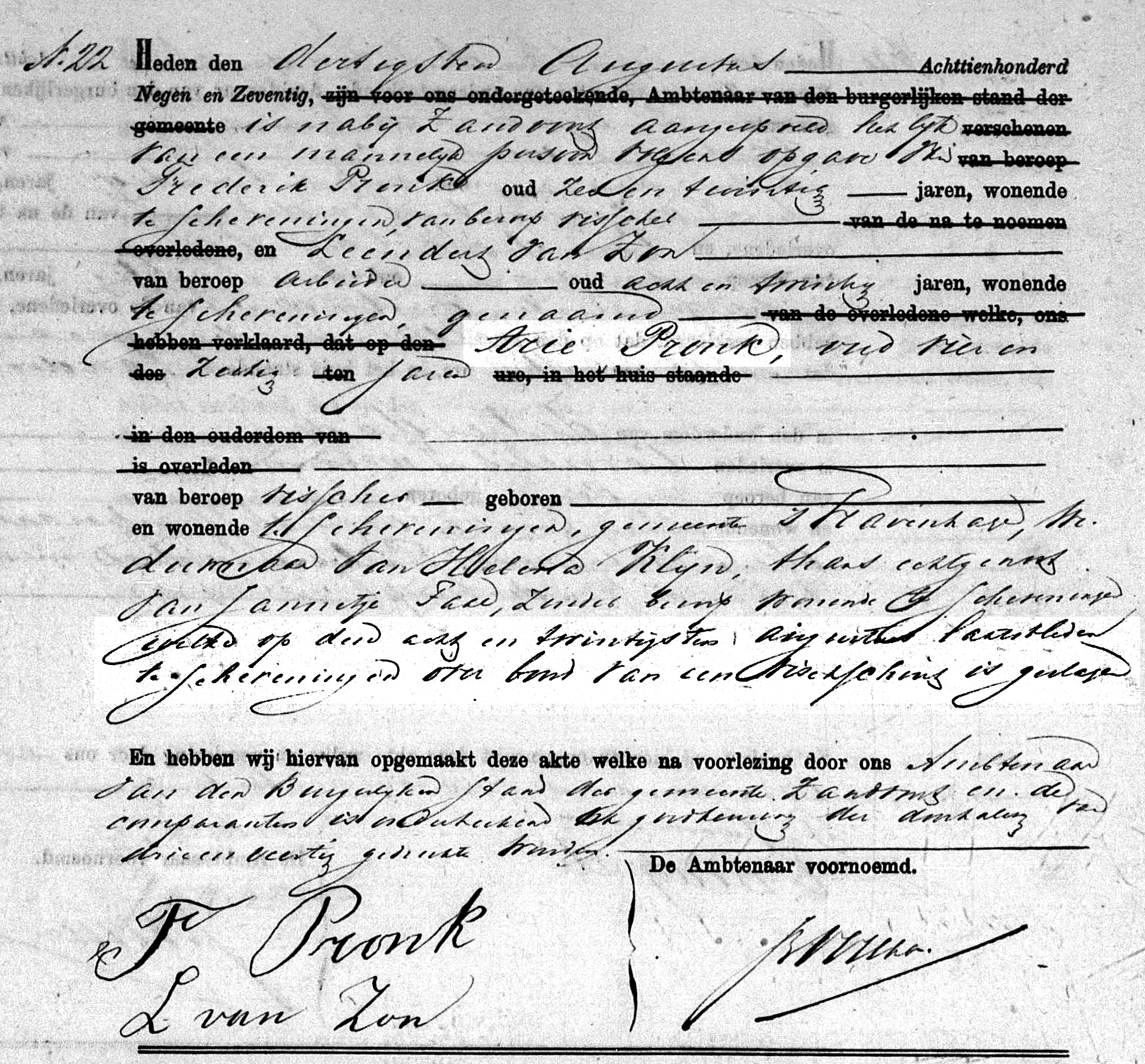 De reis was al gedaan, de vangst was rijkelijk geweest, de halve bemanning was al naar huis, maar nog viel er een slachtoffer te betreuren op de bomschuit van schipper Verheij. De schuit was tijdens de lopende vloed te laat voor Scheveningen gekomen zodat het niet ver genoeg op het strand kon landen. Het gevolg daarvan was dat slechts de halve lading kon worden gelost. Er moest dus een nieuwe vloed worden afgewacht om de resterende lading van boord te kunnen halen. De opkomende vloed ging echter gepaard met een stormachtige wind uit het zuidwesten en een gierende vloed langs het strand. De schuit lag daarin zeer ongelukkig. Bovendien waren na het lossen van een gedeelte van de lading vijf vissers alvast naar hun woning vertrokken. De vier aan boord gebleven vissers dreigden intussen in levensgevaar te raken. Om tien uur ‘s avonds werd aan wal besloten om de vier met de Scheveningse roeireddingboot van boord te halen. Het bleek echter niet mogelijk om door de wirwar van uitstaande lijnen en ankers van andere pinken de in gevaar verkerende schuit te naderen. Ondertussen was een van de bemanningsleden er in geslaagd om hangend aan het uitstaande landtouw het strand te bereiken. De overige drie vissers voelden daar echter niet veel voor. Vanaf het strand werden nog pogingen ondernomen om met het vuurpijltoestel een lijnverbinding tot stand te brengen. Pas rond half vijf in de ochtend lukte het de ankerzetter Jacob van Duyn om een deugdelijke lijn aan boord van het schip te brengen. Slechts twee vissers konden toen behouden aan wal worden gebracht. De derde, Arie Pronk, was omstreeks middernacht overboord geslagen en verdronken. Pronk spoelde op 30 augustus op het strand bij Zandvoort aan.