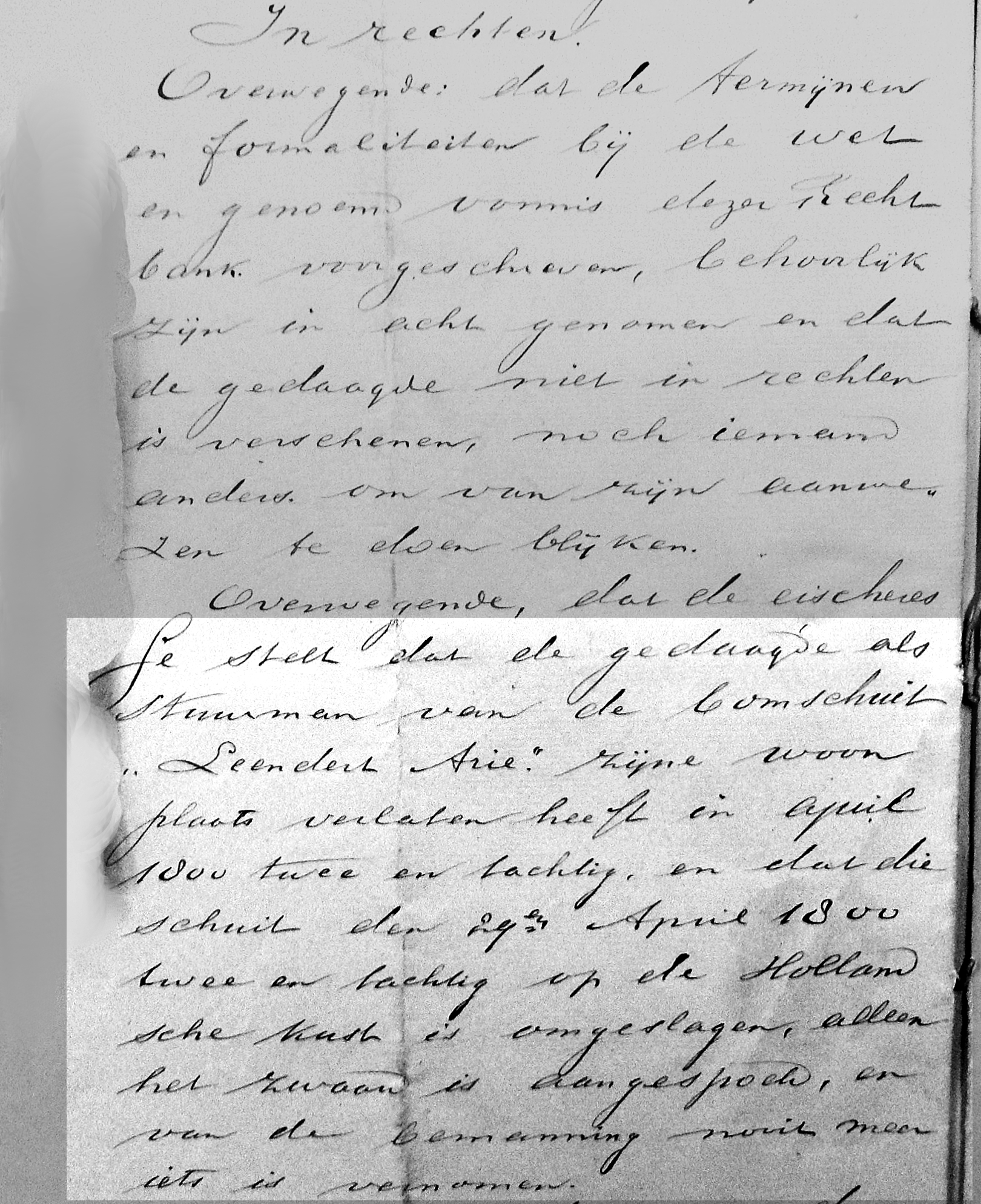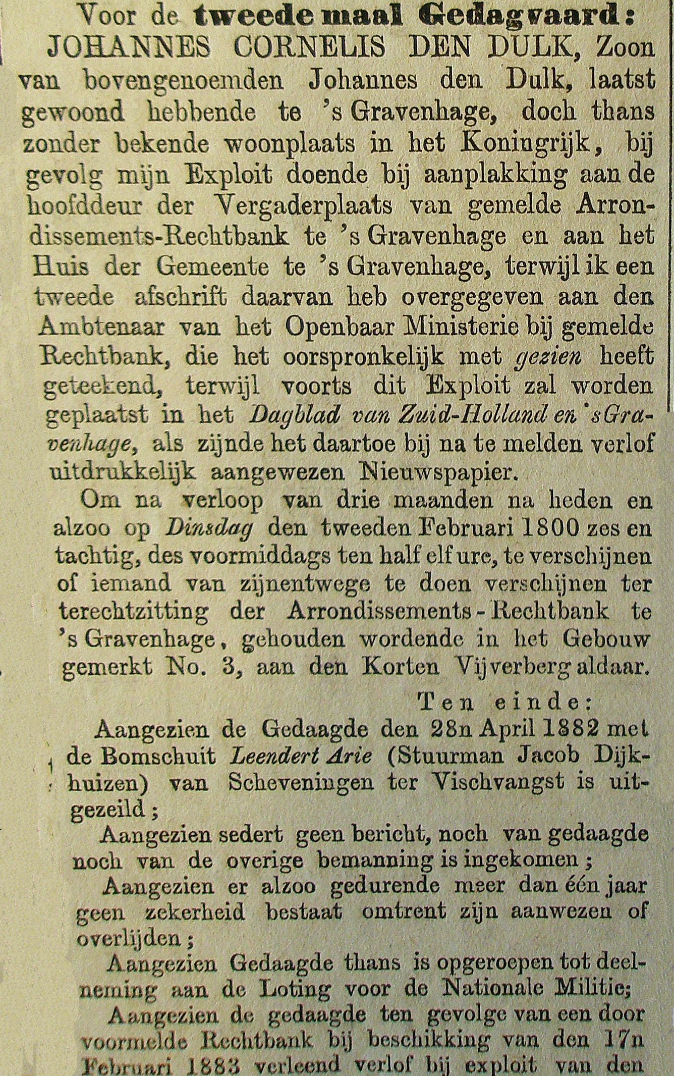 Eind april was er weer een storm op de Noordzee geweest en na tien dagen was er nog steeds geen bericht van een drietal Scheveningse bomschuiten. Wel waren er goederen aangespoeld waaronder een zwaard met merktekens waarvan men aannam dat deze van de bomschuit ‘Leendert Arie’ afkomstig was. Op 13 mei was er toch een gunstig bericht van twee van de drie bomschuiten gekomen, echter van de Leendert Arie werd niets meer vernomen.