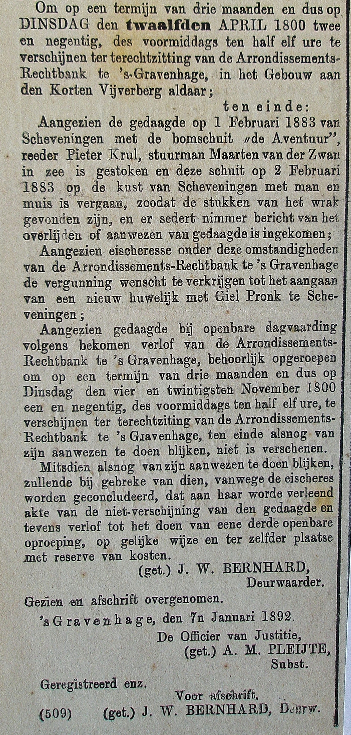 In de eerste week van februari was de bomschuit Avontuur naar de visgronden vertrokken maar in de derde week van die maand was er nog steeds niets van het schip vernomen. En het had gestormd in die voorgaande weken zodat de ongerustheid toeslag. Bovendien was na het slechte weer de windrichting Noord- en Noordwest gebleven- dus gunstig om thuis te zeilen- waardoor men allang in havens als Nieuwendiep of IJmuiden had kunnen binnenlopen stelde men destijds. In de derde week werd door de bemanning van de Scheveningse bomschuit Heiligerlee een vaatje petroleum aangebracht wat afkomstig van de Avontuur bleek te zijn. Ook de leverancier, die werd opgeroepen, herkende zijn artikel. Ook de oorspronkelijke stuurman/schipper van de Avontuur Arie Leenderd Dijkhuizen, die door ziekte juist die reis moest thuisblijven, herkende het vaatje. Al in mei liet de rederij van de weduwe P. Krul op de Vlaardingse werf Van Dam een logger bouwen. Het was haar eerste kielschip en zij gaf het de naam Avontuur. Schipper daarop werd de fortuinlijke Arie Leenderd Dijkhuizen.