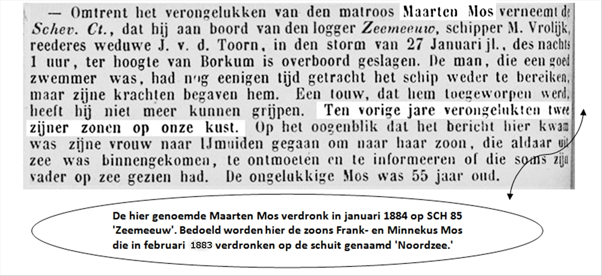 * Minnekus- en Frank Mos zijn broers. Hun vader Maarten Mos verdronk in januari 1884 op de SCH 85 'De Zeemeeuw'. In de berichtgeving daarvan wordt het eerdere omkomen van zijn zoons genooemd.