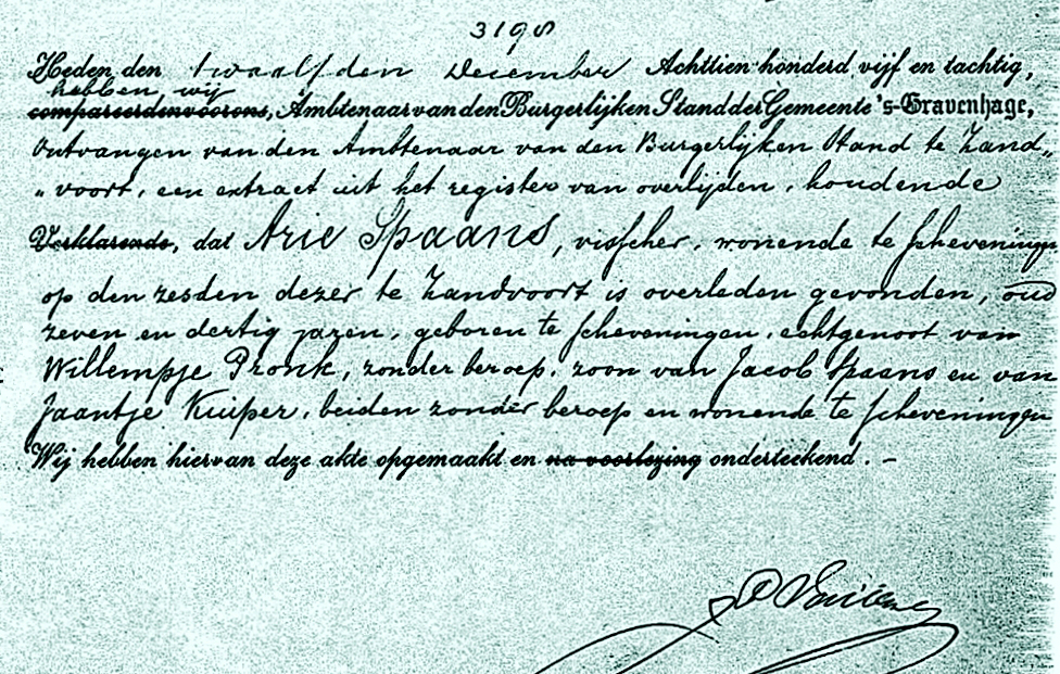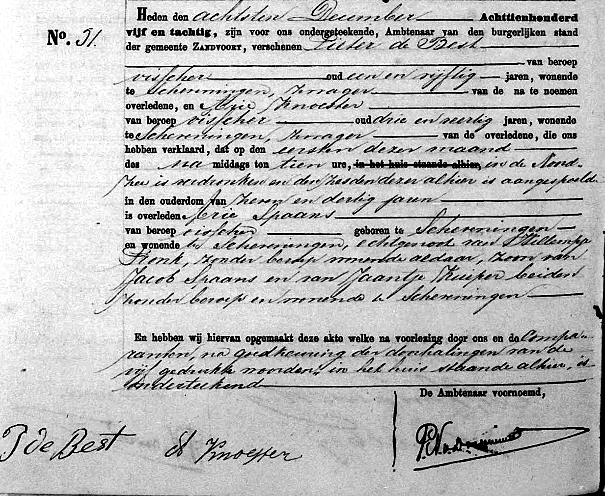 Tijdens het door de branding aankomen aan het Scheveningse strand sloeg Arie Spaans door een overkomende breker overboord. Het vanaf de bomschuit toegeworpen touwwerk had geen resultaat zodat Spaans, een vader van zeven kinderen, verdronk. Op 6 december spoelde op het strand van Zandvoort het lichaam aan.