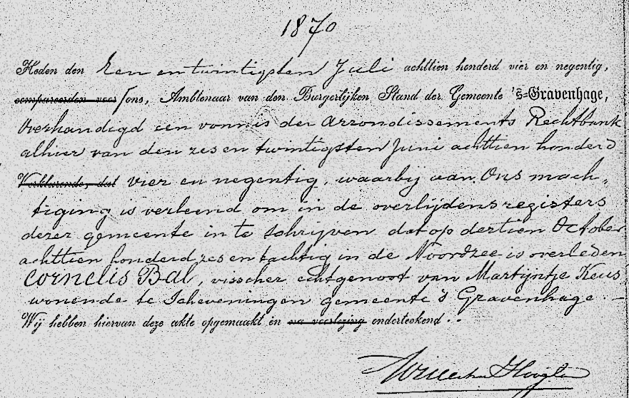 Tijdens stormweer werd schipper Cornelis Bal door een rukwind overboord geslagen. Pogingen, met toewerpen van lijnen en het toesteken van haken, mochten niet meer baten, hij verdween onder water.