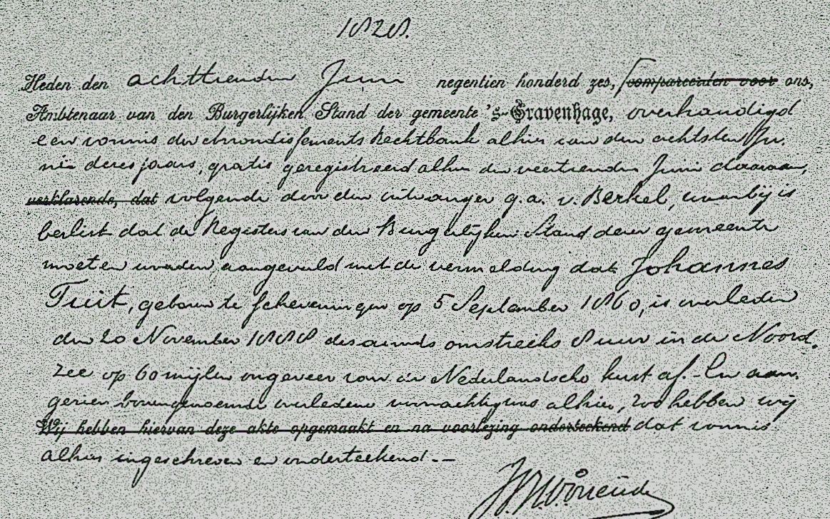 Rond 23 november kwam van de te Vlaardingen binnengelopen schuit het bericht dat op circa 60 mijlen verwijderd van de Nederlandse kust matroos Johannes Tuit overboord was geslagen en verdronken. Tuit liet een vrouw en drie kinderen na.