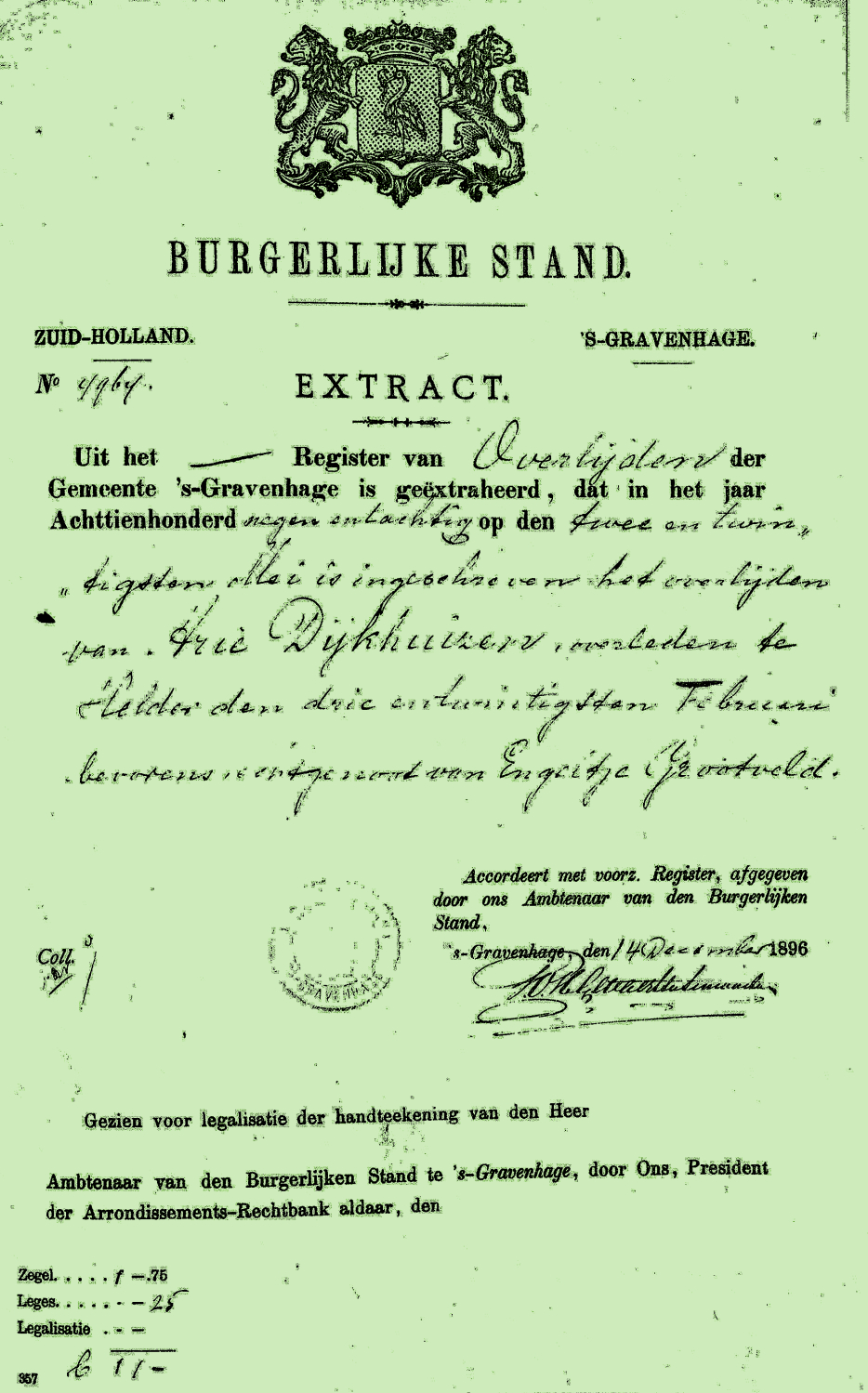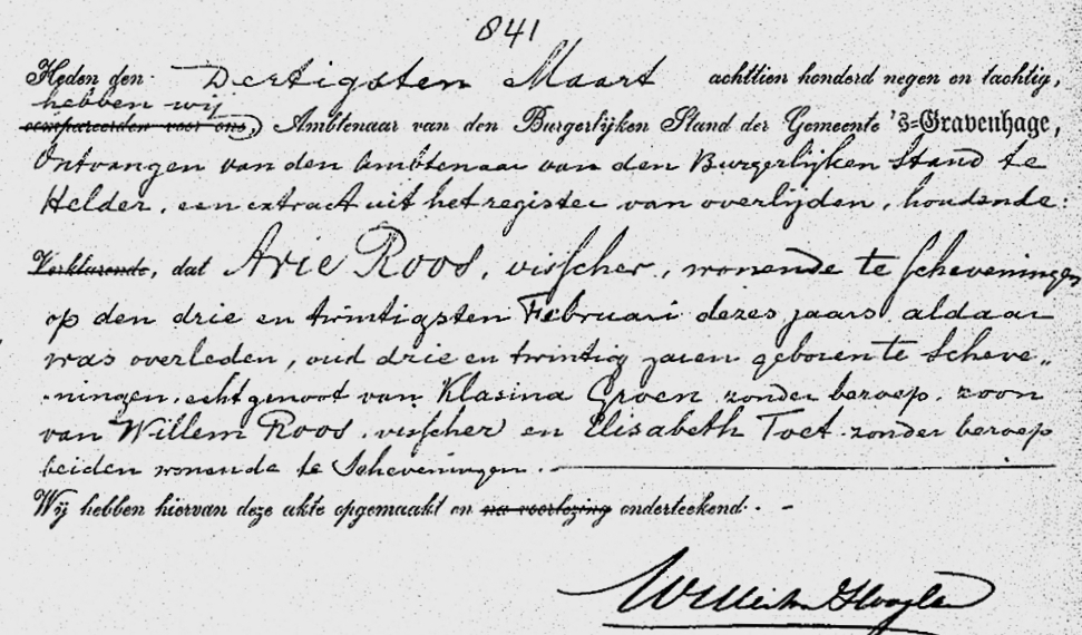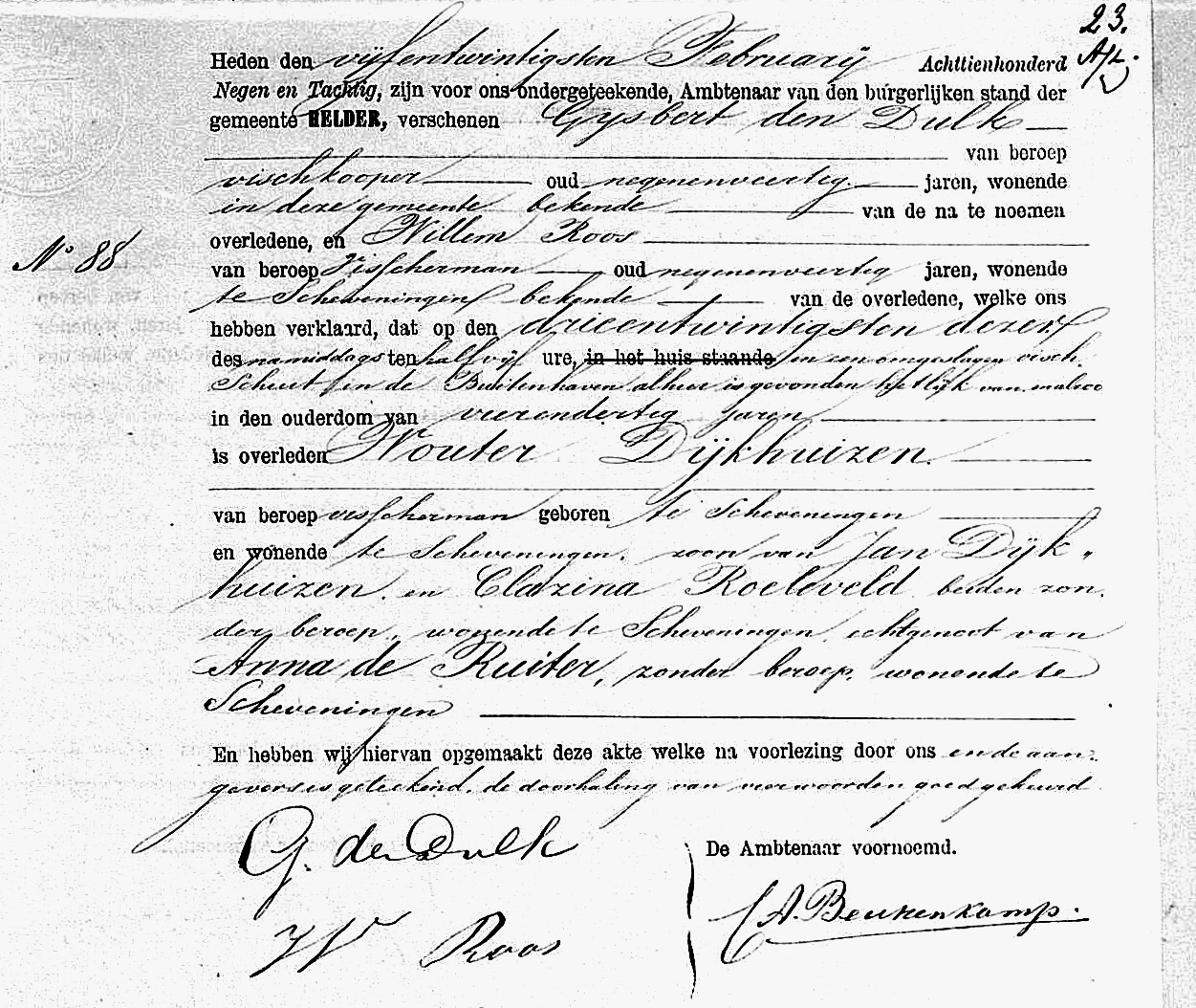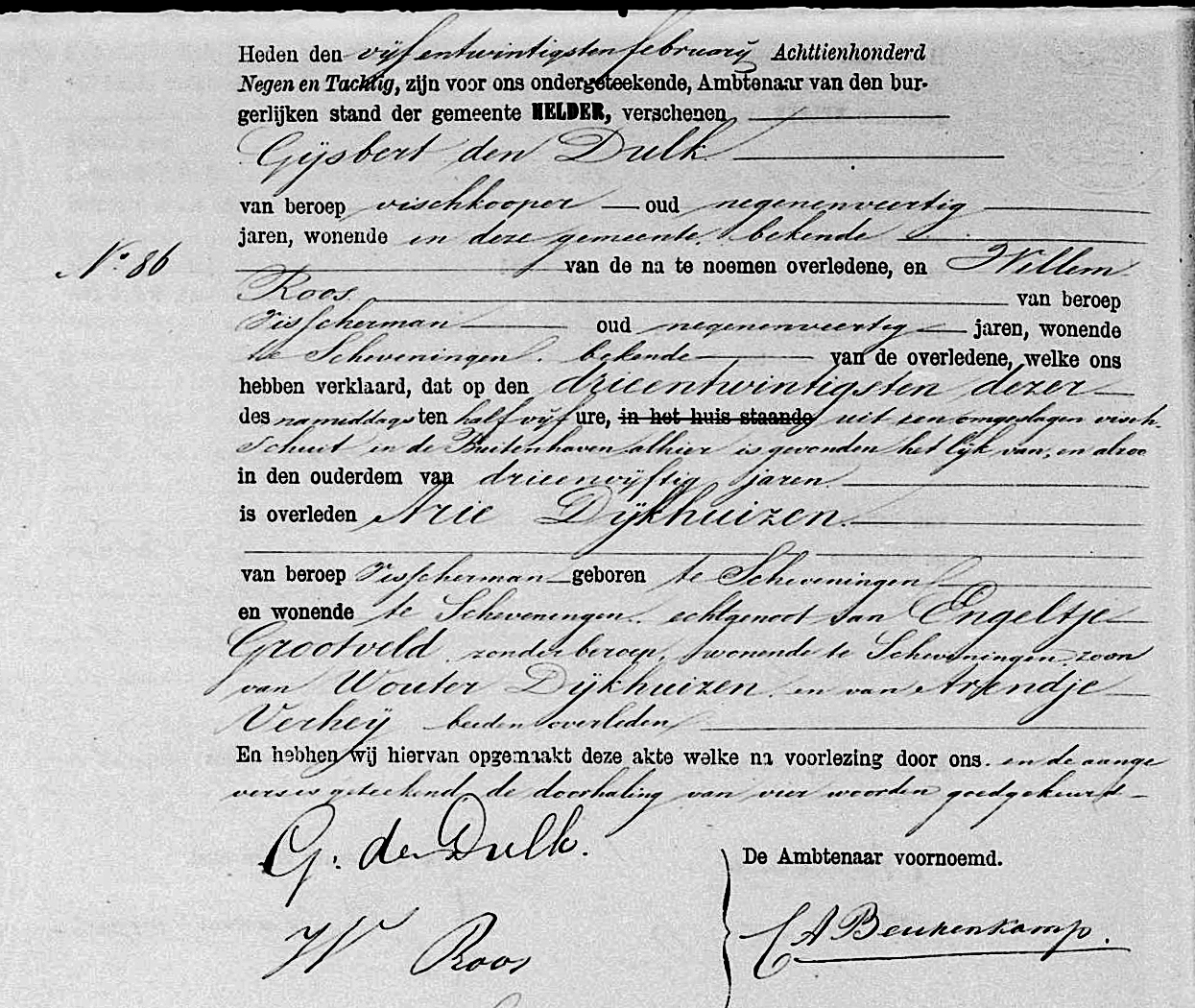 In diezelfde dagen kwam er de jobstijding. Tussen Scheveningen en Katwijk waren op het strand een halve mast, acht luiken en twee zwaarden aangespoeld. De zwaarden waren voorzien van de initialen K. D. H. De letters stonden voor Krijn Dijkhuizen, schipper van de bomschuit De Vier Gebroeders. Er was toen zekerheid dat de bomschuit tijdens de storm met zeven vissers was vergaan.