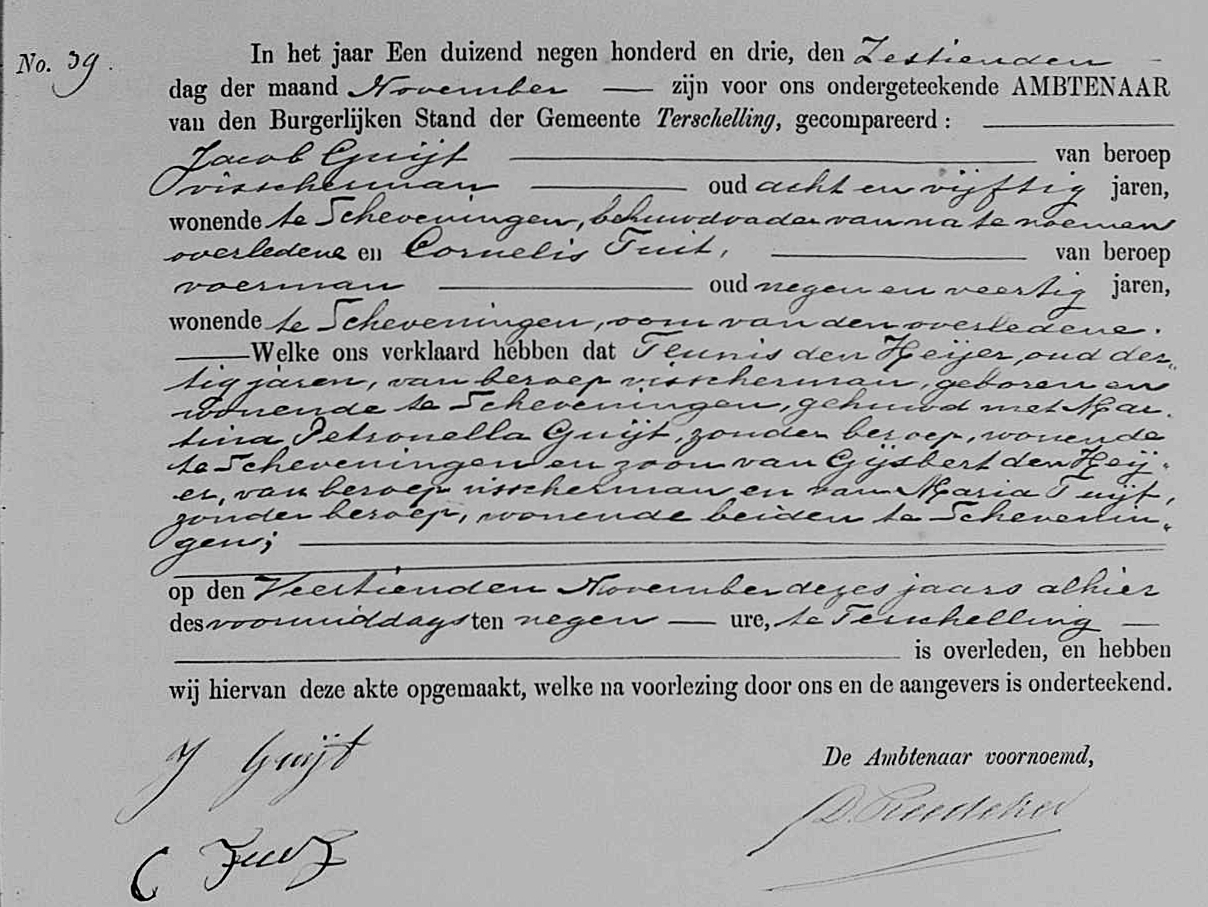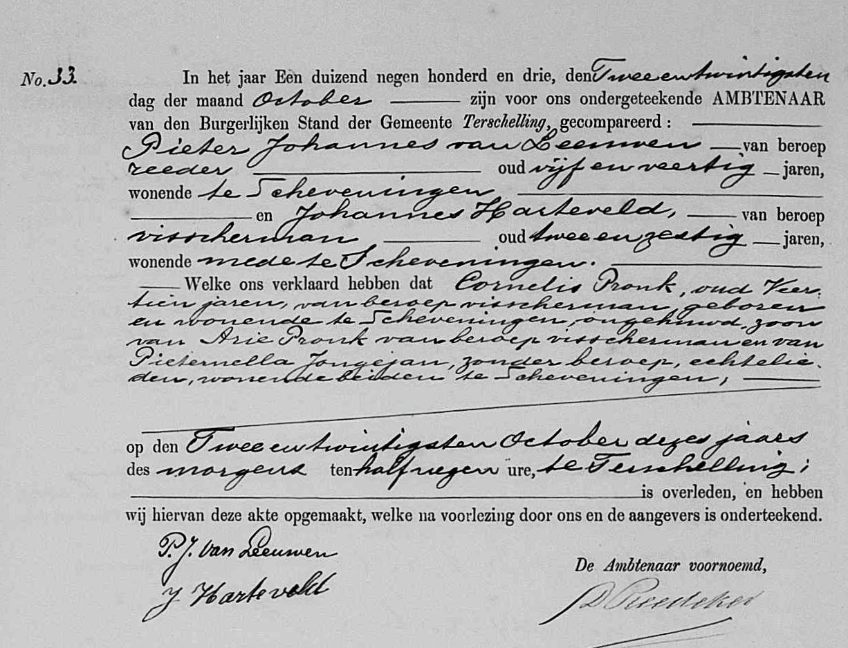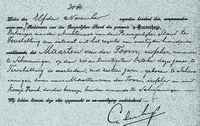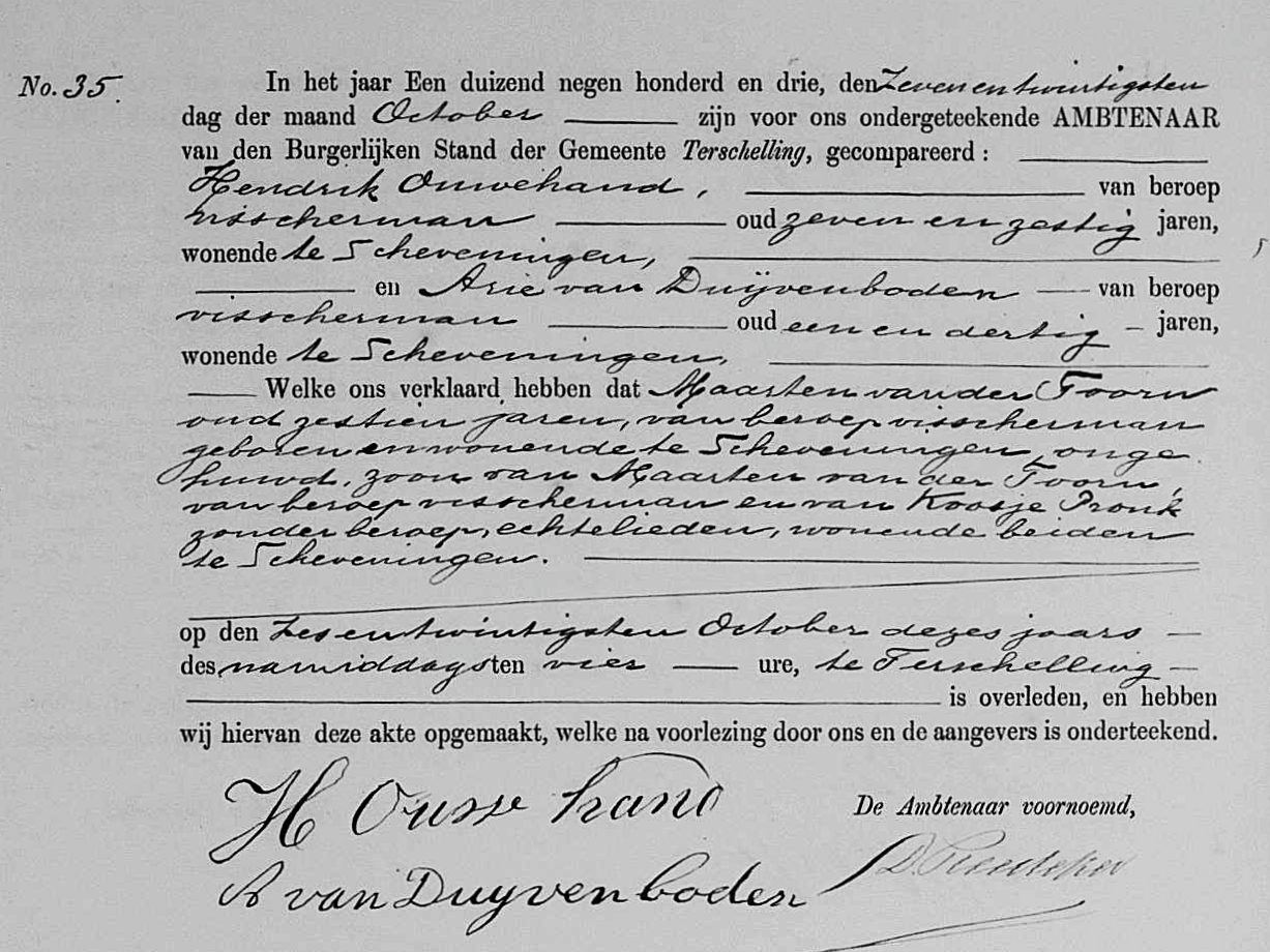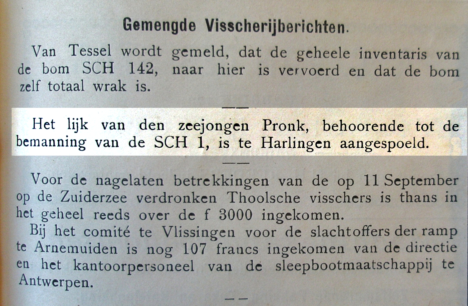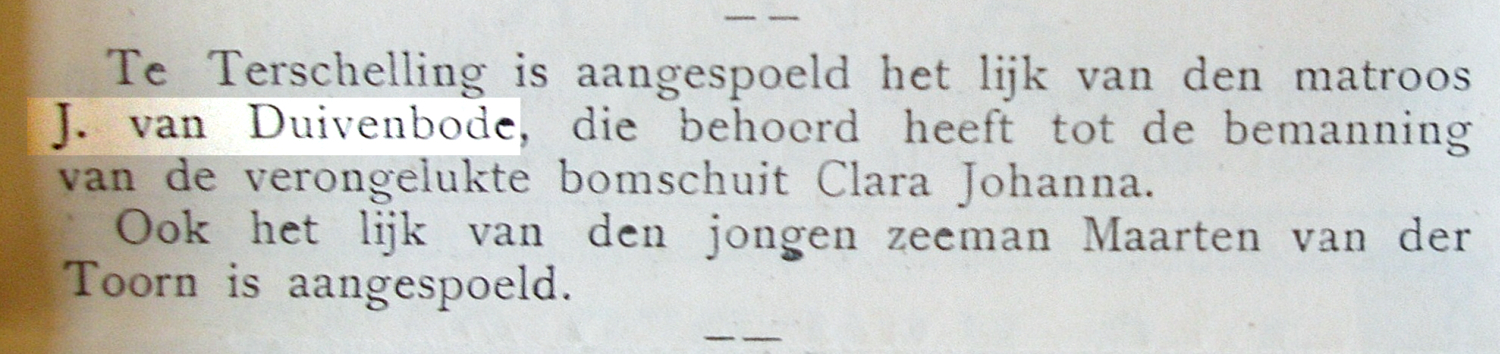 Jacob van Duijvenboden: geboren te Katwijk maar wonend te Scheveningen spoelde de 24e oktober te Hoorn aan en werd daar begraven. Zijn zoon - Cornelis- kwam om in september 1911 op de SCH 460 'Rotterdam' en zijn zoon Dirk- verdronk in oktober 1945 op de SCH 161 'Arie van der Zwan.'