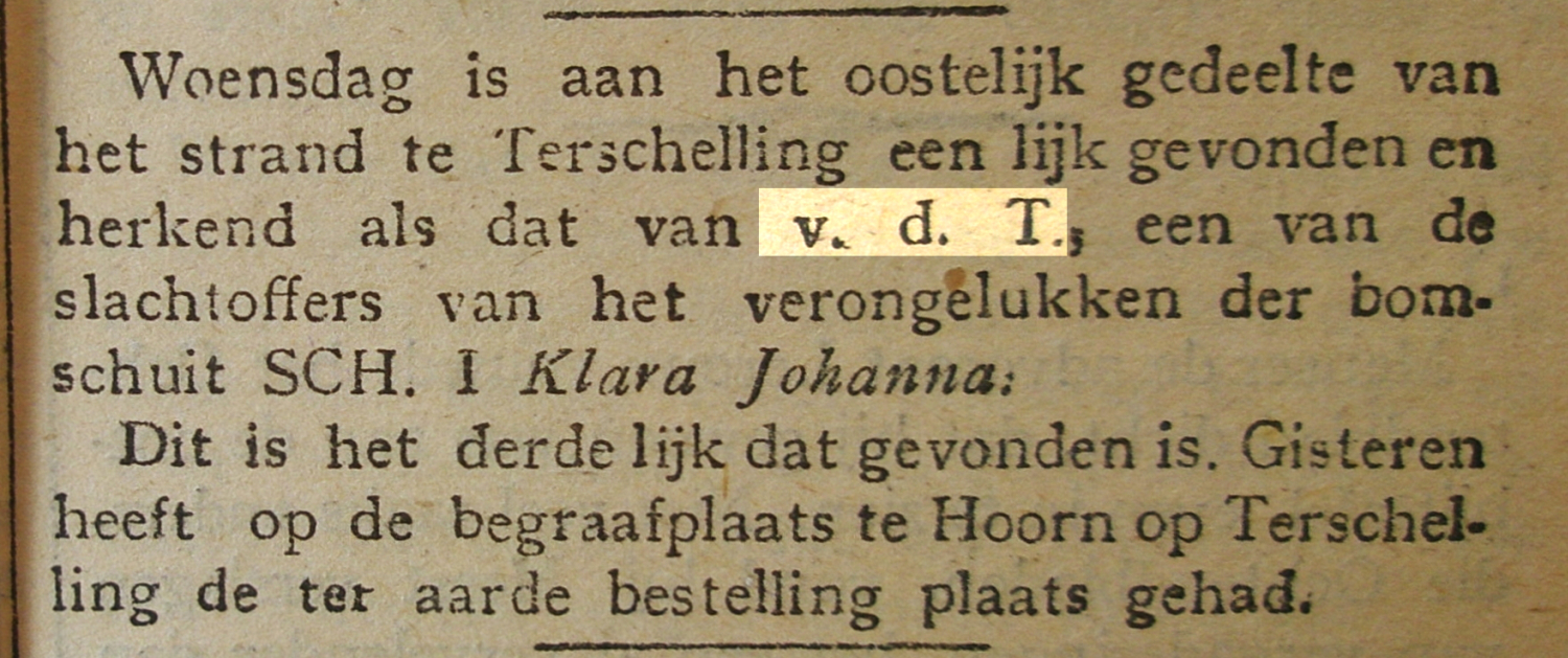 Teunis den Heijer werd op 14 november gevonden. Op 16 november werd hij begraven op het oude kerkhof achter de Brandaris. Familieleden waren voor identificatie naar Terschelling overgekomen. Ook reder van Leeuwen was meegereisd naar het eiland.