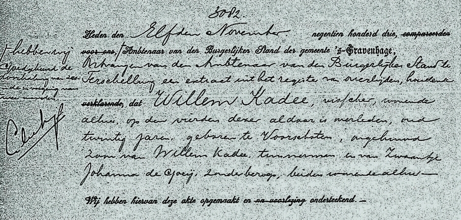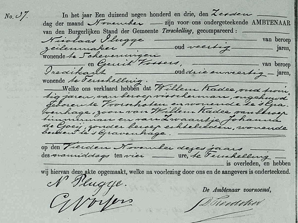Willem Kadee: was geboren te Voorschoten maar woonde in Den Haag. Hij spoelde op 4 november aan en werd op het eiland te Hoorn begraven.