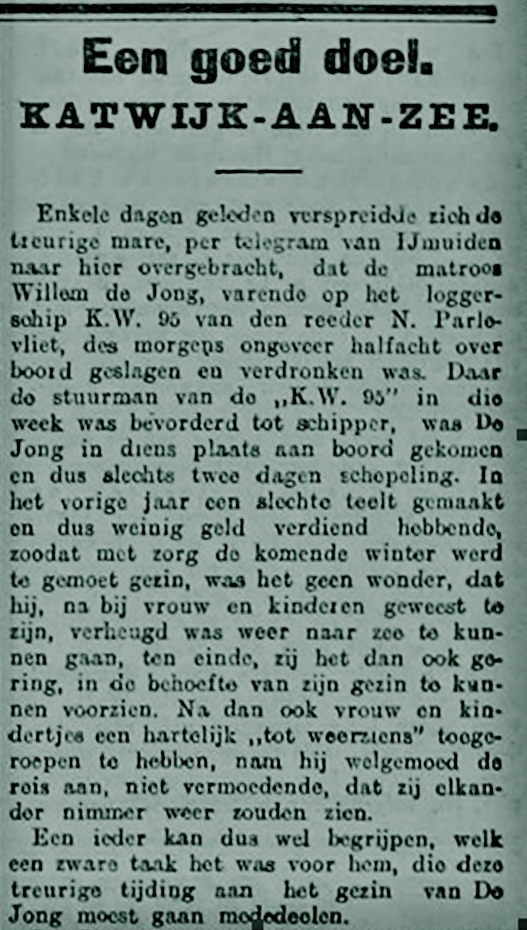 De overboord geslagen en verdronken Willem de Jong woonde te Katwijk a/zee maar is op 2 maart 1876 te Scheveningen geboren. Hij huwde op 21 december 1900 met de Katwijkse Jaboba van der Boon.