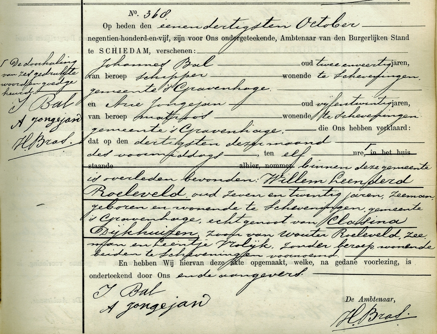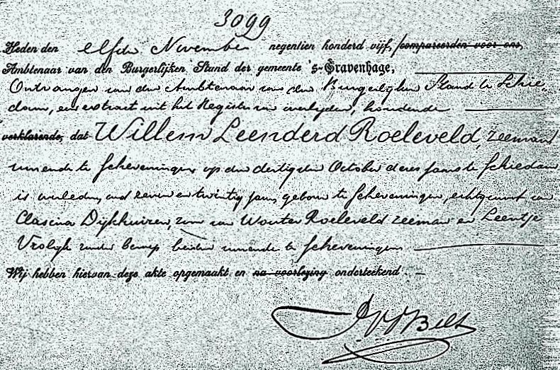 In de haven van Schiedam viel Willem Leenderd Roeleveld bij het aan boord gaan van zijn schip van de loopplank en verdronk daarbij. Roeleveld liet een vrouw en drie kinderen na.