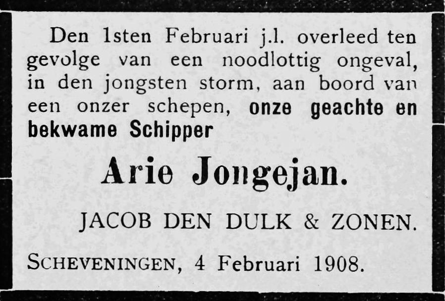 Op 20 januari 1908 zond reder Den Dulk twee van zijn schepen voor de winterharingvisserij naar de noordwestkust van Schotland. Deze vroege vorm van experimentele visserij had tot doel de vissers in hun beroep bezig te houden en een gunstiger resultaat te verkrijgen dan de trawlvisserij op rond- of platvis gedurende de wintermaanden bood. Het was aanvankelijk de bedoeling om het Schotse Stornoway - gelegen op het Hebriden-eiland Lewis- te bereiken om vanuit die vissersplaats, te haringvisserij uit te oefenen. De twee houten zeilloggers de SCH 252 ‘Zeeburg’en de SCH 307 ‘De Hoop’ kregen echter al tijdens de uitreis met veel stormweer te kampen. Hoewel het Caladonian Canal, een verbinding tussen het noordelijk gedeelte van de Noordzee en de westkust van Schotland, al tientallen jaren gereed was kozen de schippers Jongejan en Pronk vermoedelijk voor de meer noordelijke maar verraderlijke doorvaart van de Pentland Firth. Vast staat dat de ‘Zeeburg’ de wateren rond Stornoway niet bereikte en aan vissen is toegekomen. Stortzeeën bestookten de logger waarbij schipper Arie Jongejan tussen een stuk weggeslagen verschansing en de mast bekneld raakte waarbij zijn borstkas werd ingedrukt en enkele uren daarna overleed. Met veel averij aan de logger koos de bemanning voor de terugreis waarna het in de eerste week van februari, met aan boord het lichaam van hun schipper, Vlaardingen binnenliep van waaruit men reder Den Dulk op de hoogte stelde. Op 5 februari kon bij de burgerlijke stand het overlijden van Arie Jongejan worden aangegeven.