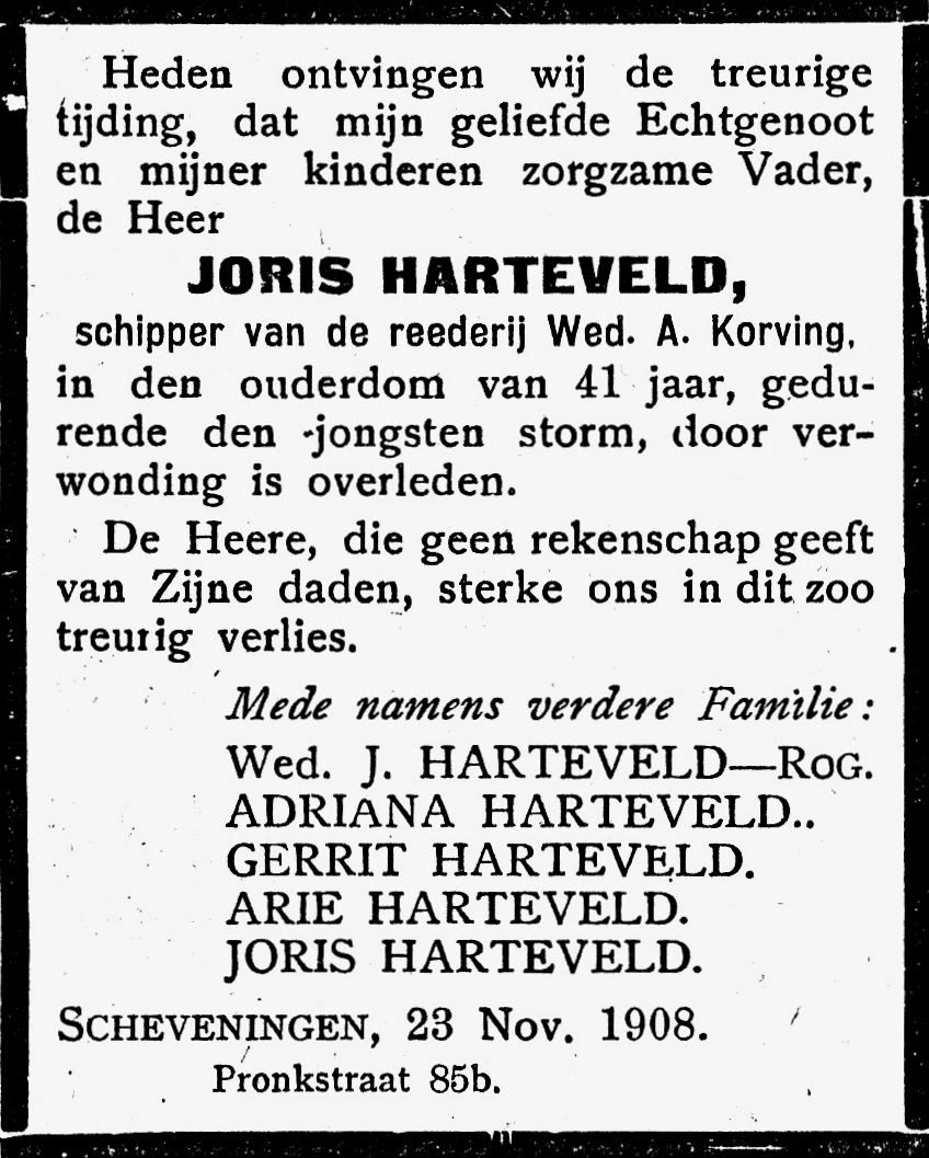 Een stortzee sloeg de schipper zodanig tegen het dek en de verschansing aan dat hij naast een gapende hoofdwond en een hersenschudding nog een verbrijzeld been opliep. Een matroos raakte zwaar gekneusd aan een been. De schipper Joris Harteveld overleed echter binnen enkele uren aan zijn verwondingen. Het lichaam werd te Vlaardingen aan wal gebracht en vervolgens naar zijn woning te Scheveningen vervoerd. Op 28 november vond de gezamenlijke begrafenis met die van Minnekus Plugge, stuurman van de SCH 47, plaats. De Scheveningse godsdienstleraren Ter Avest en Douma leidden de plechtigheid.