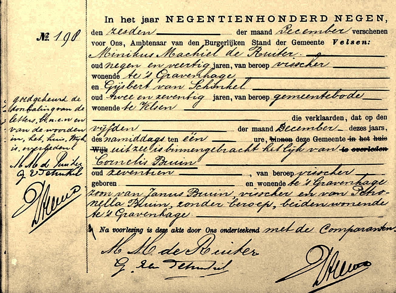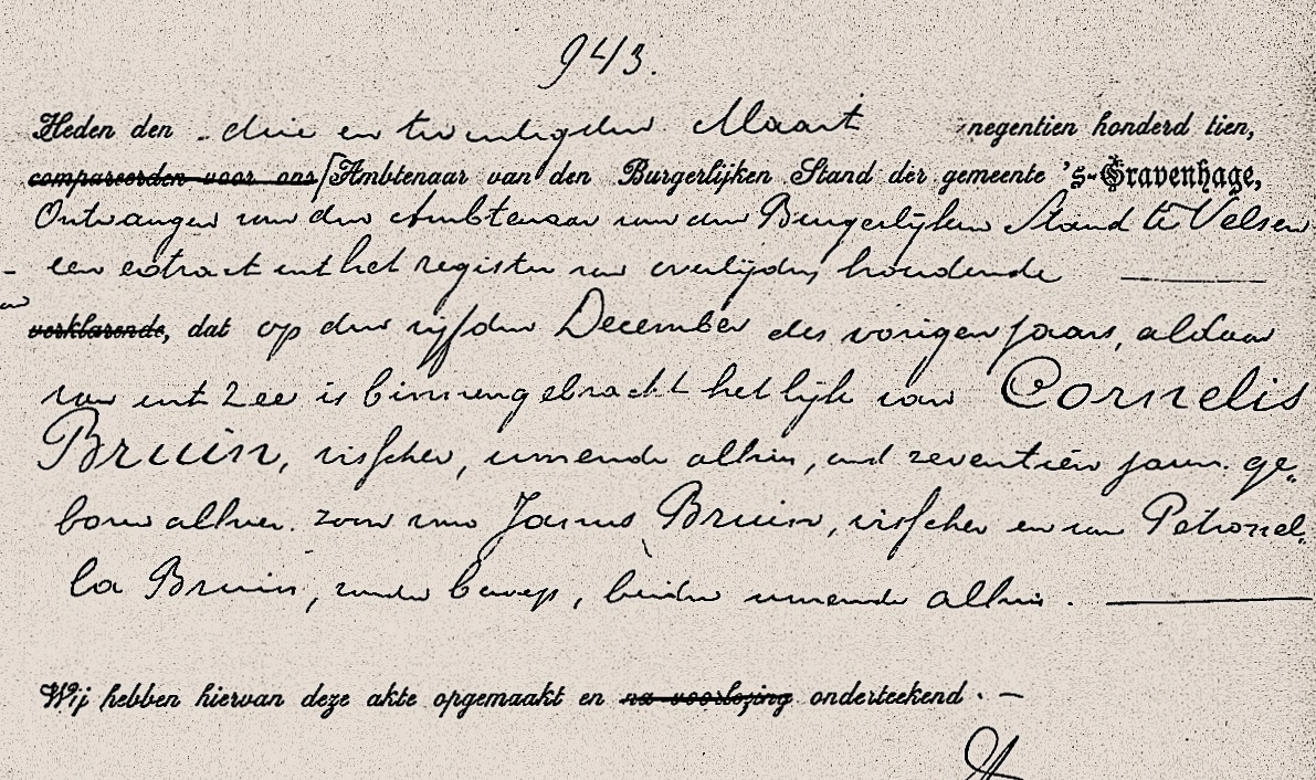 Van het verongelukken van Cornelis Bruin zijn een drietal versies aangetroffen. Bruin zou tijdens stormweer door een stortzee met een klap van de giek tegen het spil zijn geslagen en daartussen zijn doodgedrukt. Andere informatie gaf aan dat de slingerende giek van de bomschuit hem een dodelijke slag zou hebben toegediend. Anderzijds zou de jonge Bruin door de stortzee zo hard tegen het dek zijn geslagen dat hij aan kneuzingen overleed. Hoe dan ook het lichaam kon te IJmuiden aan wal worden gebracht.