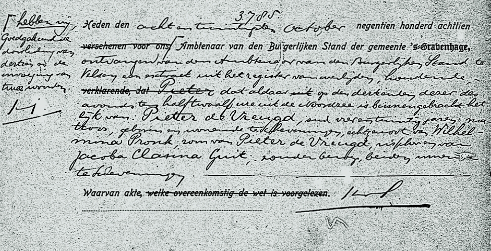 Op 13 oktober werd met de SCH 385 het dode lichaaam van Pieter de Vreugd te IJmuiden aangebracht. Mogelijk betreft het hier een geval van de toen sterk heersende Spaanse griep.