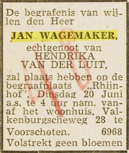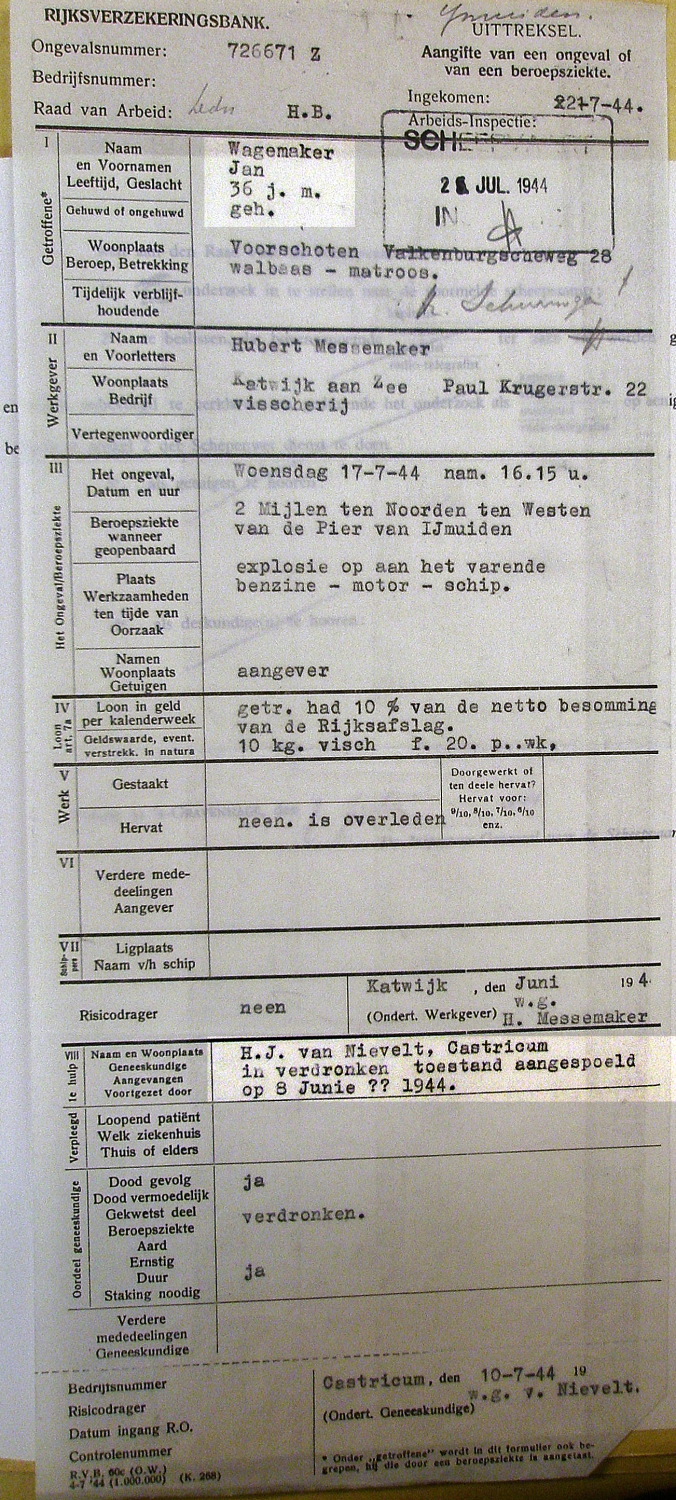 Jan Wagemaker spoelde op 16 juni op het strand van Castricum aan en werd op 20 juni te Voorschoten begraven.