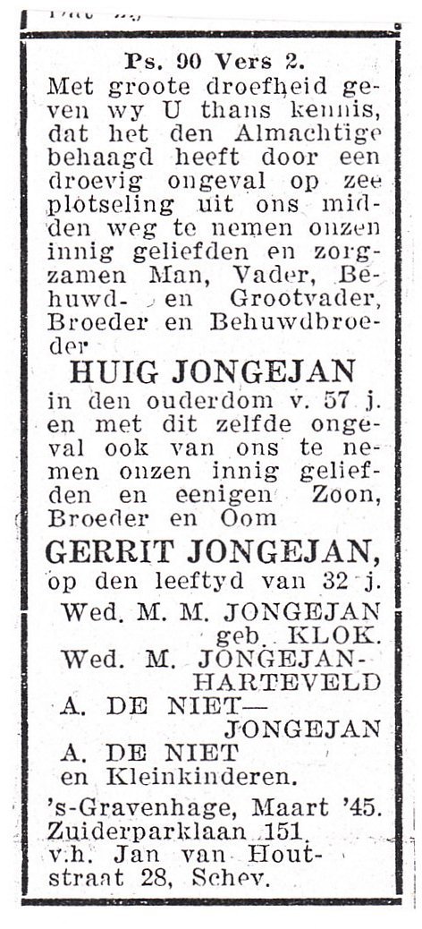 * Gijsbert Beekhuizen: zijn vader Arie- kwam in dezelfde maand om op de SCH 65 'Onderneming'.