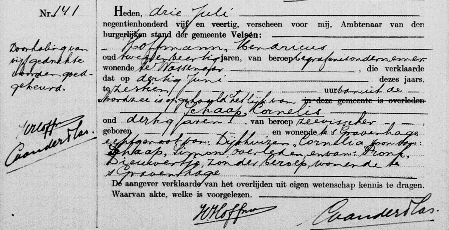 Met defecte motor voor de havenhoofden van IJmuiden vergaan. (1945)