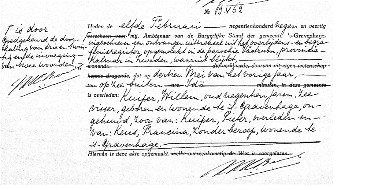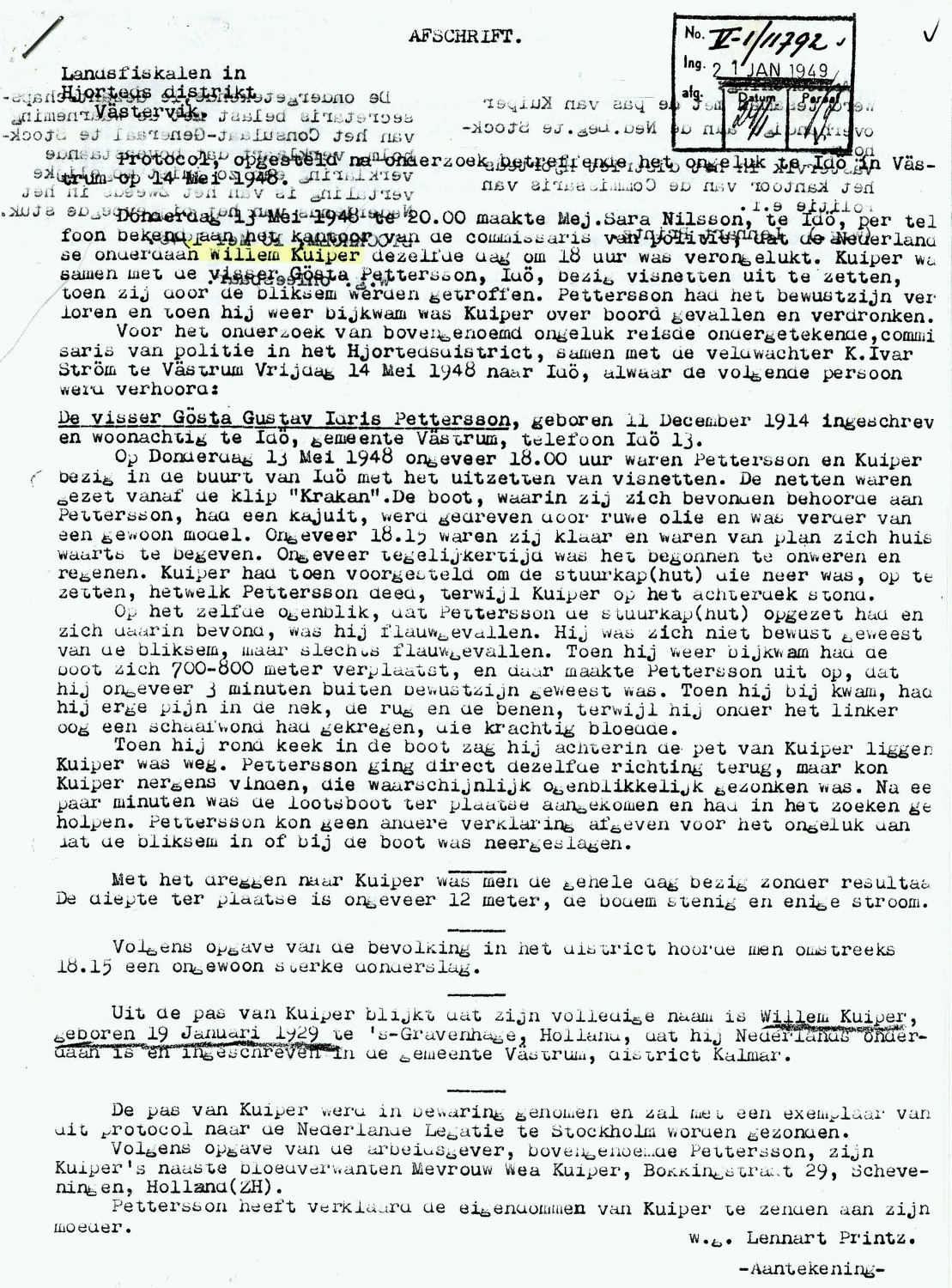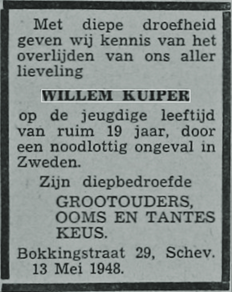 In het kader van een gezondheids-jeuguitzending naar Zweden is in de wateren rond Västrom op een twee-persoonsvissersbootje Scheveninger Willem Kuiper omgekomen. Het kleine scheepje, met twee personen bemand, werd door bliksem getroffen waarbij Kuiper overboord sloeg en verdronk. Het dode lichaam van Kuiper werd op 27 juli drijvende gevonden en aldaar begraven.