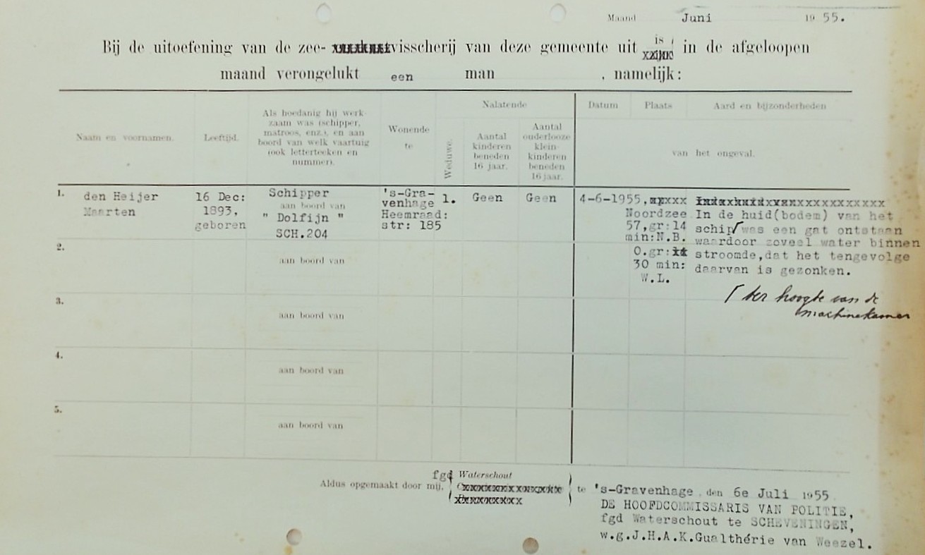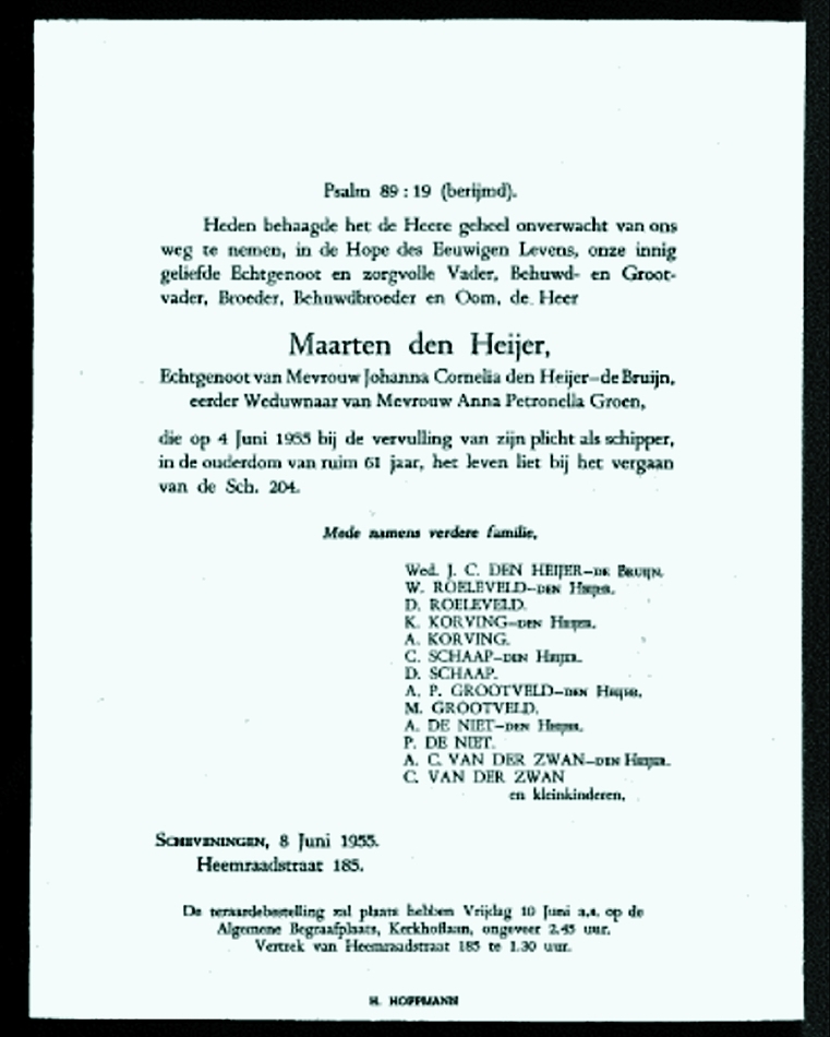 De lekgeraakte logger werd door de SCH 305 naar het Schotse Aberdeen gesleept. De schipper bleef daarbij alleen aan boord. De logger zonk echter tijdens de sleep waarbij schipper Maarten den Heijer verdronk.