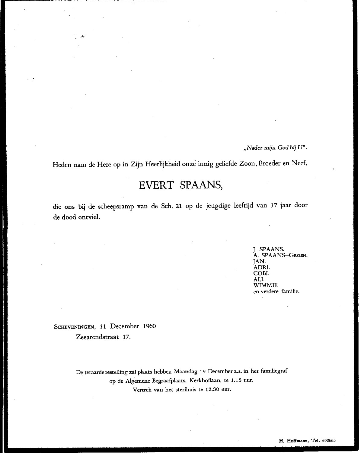 De logger liep op het zuiderhavenhoofd van Scheveningen waarbij door overkomend water Evert Jacobus Ment Spaans overboord sloeg en verdronk.