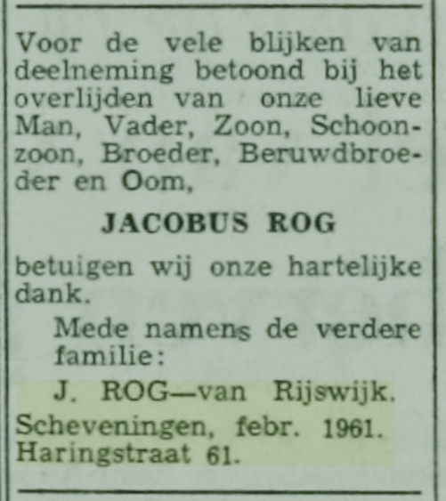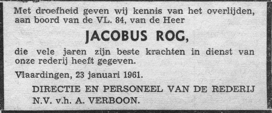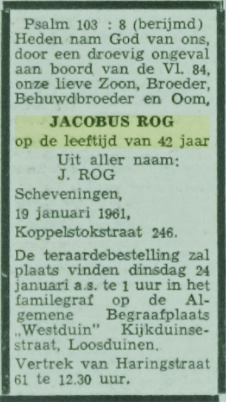 Tijdens storm overboord geslagen en verdronken Jacobus Rog. Het lichaam kon aan wal worden gebracht.