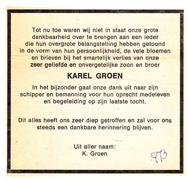Tijdens het aanwinden van de vislijnen met de messinghaak brak deze. Karel Groen raakte daarbij dodelijk gewond.