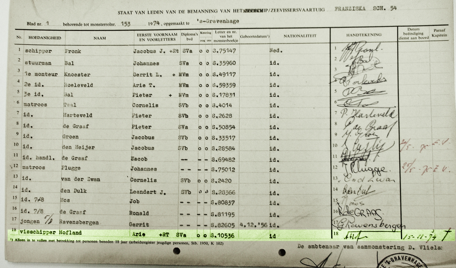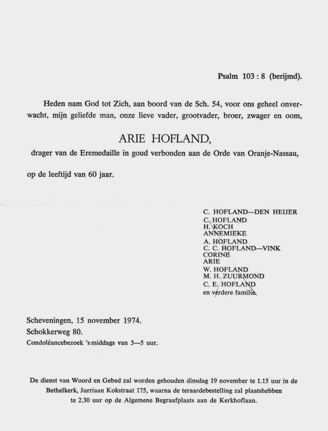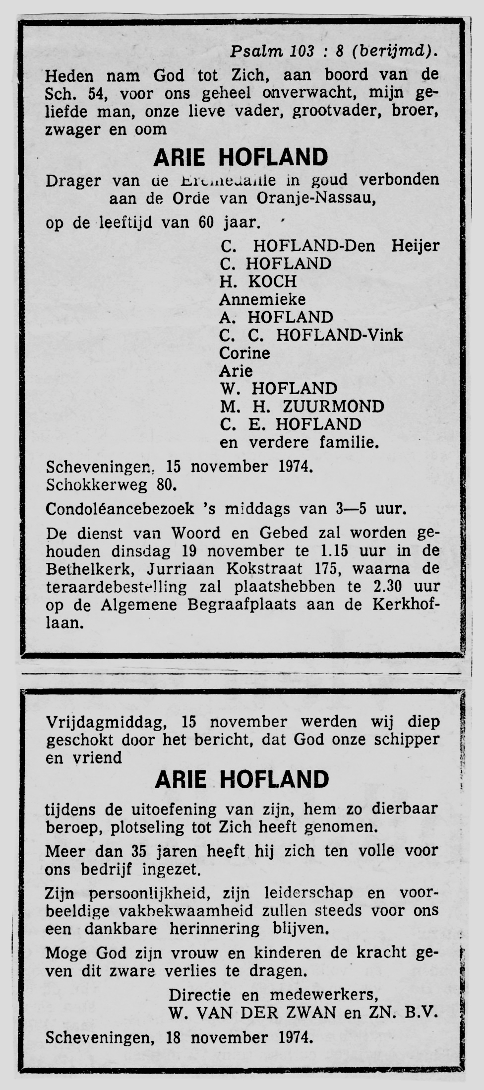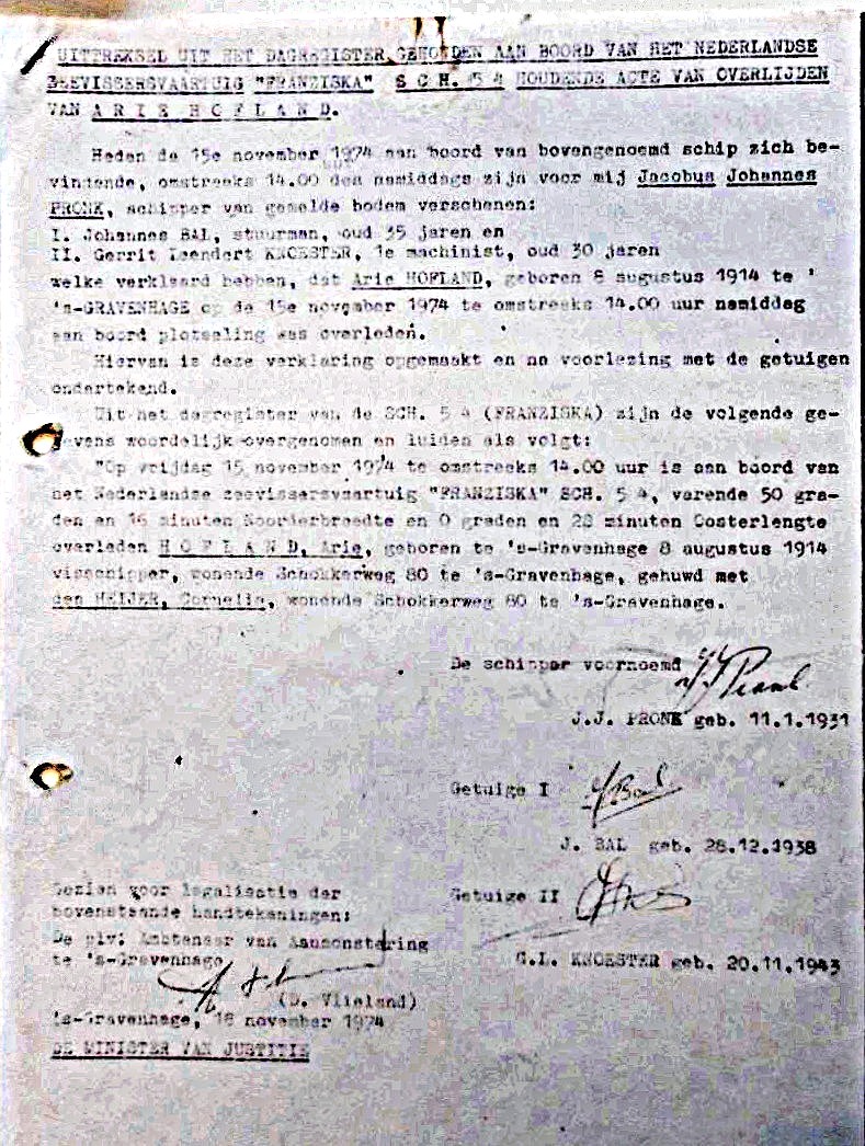 Aan boord van de hektrawler overleed de visschipper Arie Hofland.