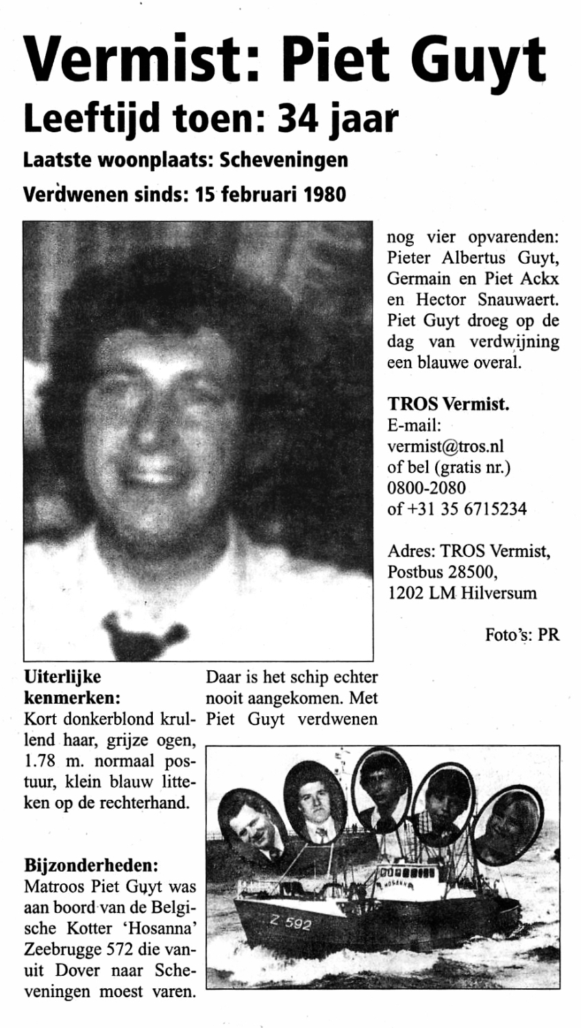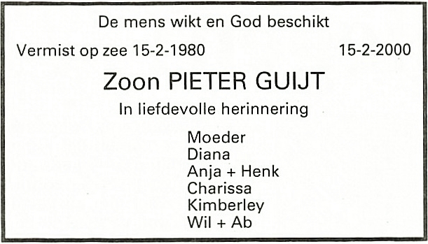 Na het vertrek van de kotter uit het Britse Dover werd niets meer van het vaartuig vernomen. Onder de vijf opvarenden bevonden zich de Scheveningers Pieter Guijt en Pieter Albertus Guijt.