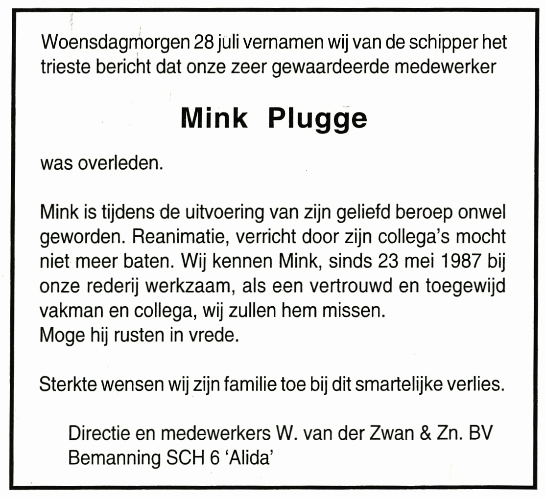 Tijdens werkzaamheden aan boord overleed de 48-jarige Minnekus Plugge. Het lichaam werd in het Schotse Aberdeen aan wal gebracht alwaar Scotland Yard een acute hartstilstand als doodsoorzaak vaststelde. Veertien dagen nadien werd het lichaam naar Nederland overgebracht waar Plugge op 13 augustus op de Algemene Begraafplaats ter aarde werd besteld.